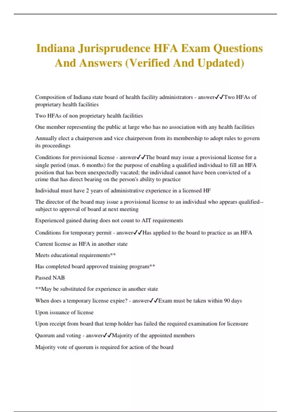 Indiana Jurisprudence HFA Exam Questions And Answers (Verified And Updated) Composition of Indiana state board of health facility administrators - answerTwo HFAs of proprietary health facilities Two HFAs of non proprietary health facilities One member representing the public at large who has no association with any health facilities Annually elect a chairperson and vice chairperson from its membership to adopt rules to govern its proceedings Conditions for provisional license - answerThe board may issue a provisional license for a single period (max. 6 months) for the purpose of enabling a qualified individual to fill an HFA position that has been unexpectedly vacated; the individual cannot have been convicted of a crime that has direct bearing on the person's ability to practice Individual must have 2 years of administrative experience in a licensed HF The director of the board may issue a provisional license to an individual who appears qualified-- subject to approval of board at next meeting Experienced gained during does not count to AIT requirements Conditions for temporary permit - answerHas applied to the board to practice as an HFA Current license as HFA in another state Meets educational requirements** Has completed board approved training program** Passed NAB **May be substituted for experience in another state When does a temporary license expire? - answerExam must be taken within 90 days Upon issuance of license Upon receipt from board that temp holder has failed the required examination for licensure Quorum and voting - answerMajority of the appointed members Majority vote of quorum is required for action of the board Powers of the board - answerAdopt rules Develop techniques for determining whether an individual meets the standards Issue/suspend/revoke licenses Enforce HFA standards Conduct one or more courses of instruction and training to meet requirements of this chapter/approve other courses in/out of state Establish CEU requirements License reinstatement - answerLess than 3 years: reinstated if application is completed, current renewal fee paid, reinstatement fee paid, provide board with sworn statement of CEU completion or meet them More than 3 years: Same as other, but may also be required to complete remediation/training deemed by board given the lapse of time involved Reciprocity requirements - answerMet educational requirements Completed approved training program/equivalent Passed NAB with 113 Passed state exam HFA practices - answerplanning organizing developing directing controlling What does preceptor mean - answerHFA approved by board A training center approved by board to oversee and manage the AIT program A NAB accredited university approved by HFA board to oversee and manage the student internship program Educational qualifications for licensure - answerApplicants for licensure must have completed all requirements at time of applications and any of the following: Possess bachelor degree from an accredited university and AIT program Completed student internship as a part of bach/masters program from university Associates degree approved by board, specialized course of study in LTC admin, and AIT program Specialized course of study in LTC admin and AIT program Applicants for licensure by endorsement - answerEducational and AIT requirements may be satisfied by two years of active work experience as licensed HFA in another state-- evidence required Requirements for AIT waiver - answerCompletion of residency-internship in HCAD completed as part of a degree requirement One year of work experience as licensed HFA AIT equivalent in another state One year of experience as CEO/COO in hospital Masters degree in HCAD and 6 months of work experience as HFA in another state The board may waive up to 30% of required hours Exam requirements - answermust be completed (and all requirements) at least 30 before exam Allowed 2 additional attempts within 1 year If they fail again, the applicant must appear before board and may be required to submit: Proof of completion of at least 200 contact hours of board approved continuing education New application for AIT entry Proof of completion of required AIT program RCA AIT comprehensive care requirements - answerMinimum of 80 hours in CCF to cover: Medicare/Medicaid CCF organization and coordination of services Assessments and care plans Time guidelines for AIT - answermin/week: 20 max/day: 10 mini/entire program: 6 months max/entire program: 12 months