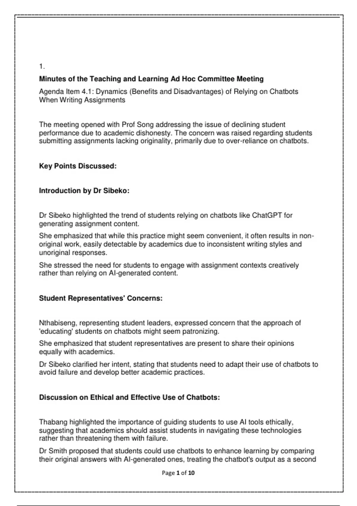 Agenda Item 4.1: Dynamics (Benefits and Disadvantages) of Relying on Chatbots