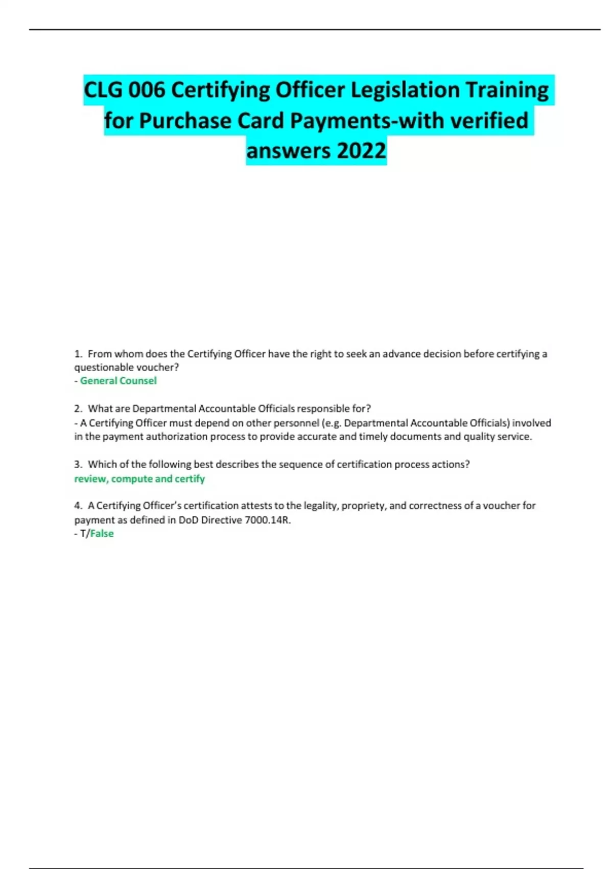 CLG 006 Certifying Officer Legislation Training for Purchase Card Payments-with verified answers