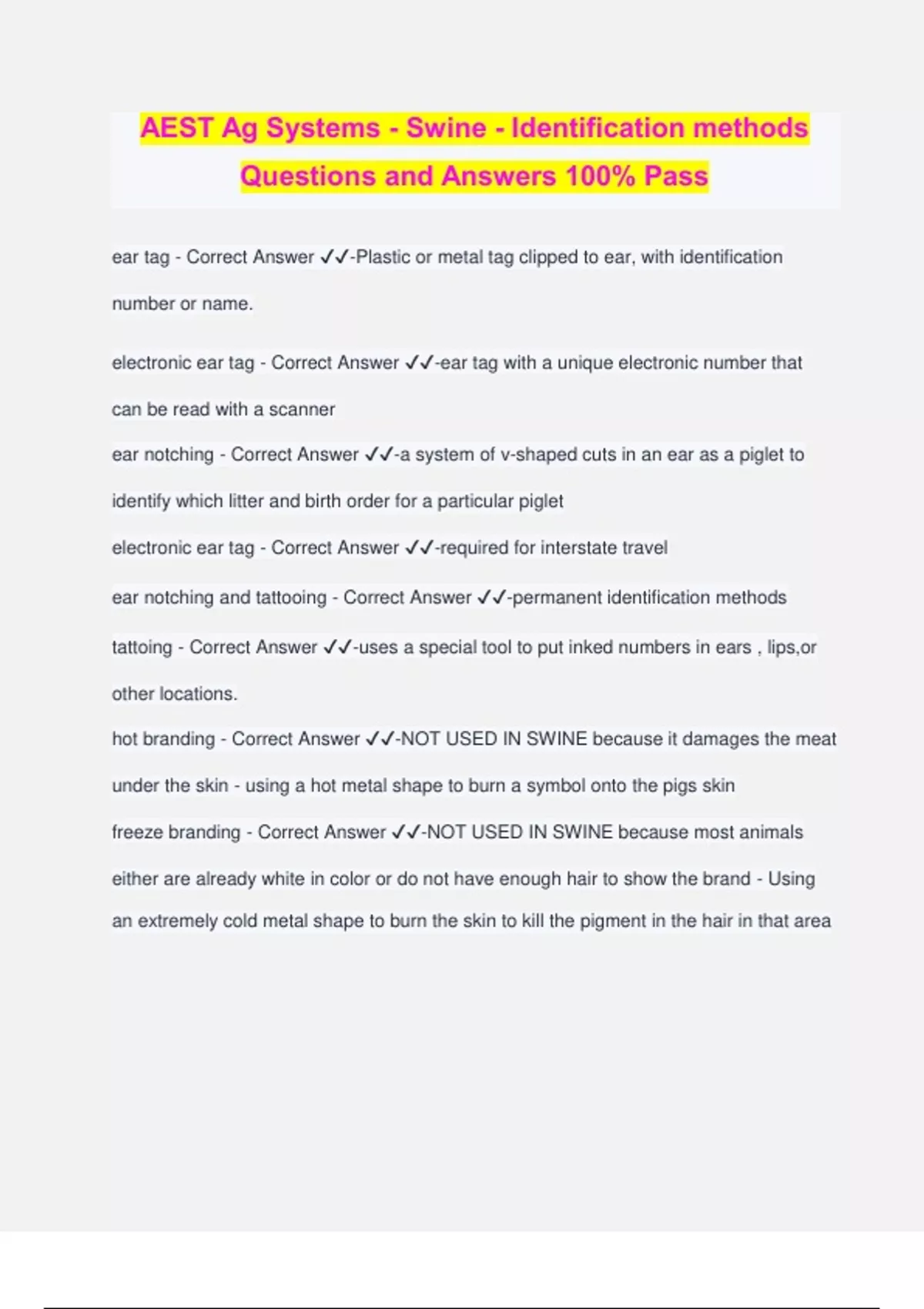 AEST Ag Systems - Swine - Identification methods Questions and Answers 100% Pass