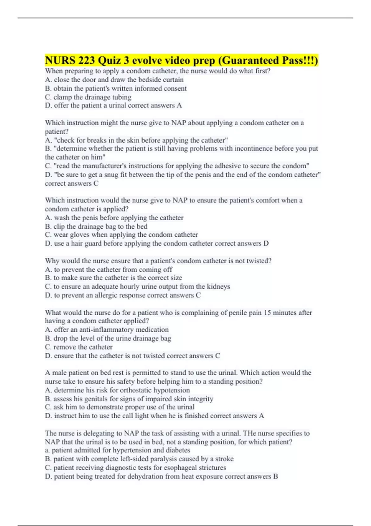 When preparing to apply a condom catheter, the nurse would do what first? A. close the door and draw the bedside curtain B. obtain the patient's written informed consent C. clamp the drainage tubing D. offer the patient a urinal correct answers A Which instruction might the nurse give to NAP about applying a condom catheter on a patient? A. "check for breaks in the skin before applying the catheter" B. "determine whether the patient is still having problems with incontinence before you put the catheter on him" C. "read the manufacturer's instructions for applying the adhesive to secure the condom" D. "be sure to get a snug fit between the tip of the penis and the end of the condom catheter" correct answers C Which instruction would the nurse give to NAP to ensure the patient's comfort when a condom catheter is applied? A. wash the penis before applying the catheter B. clip the drainage bag to the bed C. wear gloves when applying the condom catheter D. use a hair guard before applying the condom catheter correct answers D Why would the nurse ensure that a patient's condom catheter is not twisted? A. to prevent the catheter from coming off B. to make sure the catheter is the correct size C. to ensure an adequate hourly urine output from the kidneys D. to prevent an allergic response correct answers C What would the nurse do for a patient who is complaining of penile pain 15 minutes after having a condom catheter applied? A. offer an anti-inflammatory medication B. drop the level of the urine drainage bag C. remove the catheter D. ensure that the catheter is not twisted correct answers C A male patient on bed rest is permitted to stand to use the urinal. Which action would the nurse take to ensure his safety before helping him to a standing position? A. determine his risk for orthostatic hypotension B. assess his genitals for signs of impaired skin integrity C. ask him to demonstrate proper use of the urinal D. instruct him to use the call light when he is finished correct answers A The nurse is delegating to NAP the task of assisting with a urinal. THe nurse specifies to NAP that the urinal is to be used in bed, not a standing position, for which patient? a. patient admitted for hypertension and diabetes B. patient with complete left-sided paralysis caused by a stroke C. patient receiving diagnostic tests for esophageal strictures D. patient being treated for dehydration from heat exposure correct answers B