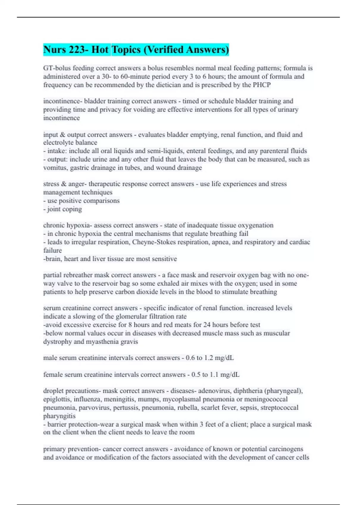GT-bolus feeding correct answers a bolus resembles normal meal feeding patterns; formula is administered over a 30- to 60-minute period every 3 to 6 hours; the amount of formula and frequency can be recommended by the dietician and is prescribed by the PHCP incontinence- bladder training correct answers - timed or schedule bladder training and providing time and privacy for voiding are effective interventions for all types of urinary incontinence input & output correct answers - evaluates bladder emptying, renal function, and fluid and electrolyte balance - intake: include all oral liquids and semi-liquids, enteral feedings, and any parenteral fluids - output: include urine and any other fluid that leaves the body that can be measured, such as vomitus, gastric drainage in tubes, and wound drainage stress & anger- therapeutic response correct answers - use life experiences and stress management techniques - use positive comparisons - joint coping chronic hypoxia- assess correct answers - state of inadequate tissue oxygenation - in chronic hypoxia the central mechanisms that regulate breathing fail - leads to irregular respiration, Cheyne-Stokes respiration, apnea, and respiratory and cardiac failure -brain, heart and liver tissue are most sensitive partial rebreather mask correct answers - a face mask and reservoir oxygen bag with no one-way valve to the reservoir bag so some exhaled air mixes with the oxygen; used in some patients to help preserve carbon dioxide levels in the blood to stimulate breathing serum creatinine correct answers - specific indicator of renal function. increased levels indicate a slowing of the glomerular filtration rate -avoid excessive exercise for 8 hours and red meats for 24 hours before test -below normal values occur in diseases with decreased muscle mass such as muscular dystrophy and myasthenia gravis male serum creatinine intervals correct answers - 0.6 to 1.2 mg/dL female serum creatinine intervals correct answers - 0.5 to 1.1 mg/dL droplet precautions- mask correct answers - diseases- adenovirus, diphtheria (pharyngeal), epiglottis, influenza, meningitis, mumps, mycoplasmal pneumonia or meningococcal pneumonia, parvovirus, pertussis, pneumonia, rubella, scarlet fever, sepsis, streptococcal pharyngitis - barrier protection-wear a surgical mask when within 3 feet of a client; place a surgical mask on the client when the client needs to leave the room primary prevention- cancer correct answers - avoidance of known or potential carcinogens and avoidance or modification of the factors associated with the development of cancer cells