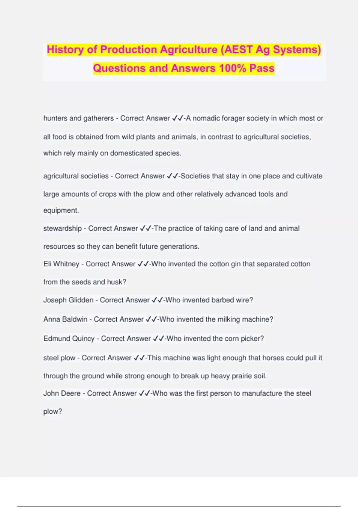 History of Production Agriculture (AEST Ag Systems) Questions and Answers 100% Pass hunters and gatherers - Correct Answer ️️ -A nomadic forager society in which most or all food is obtained from wild plants and animals, in contrast to agricultural societies, which rely mainly on domesticated species. agricultural societies - Correct Answer ️️ -Societies that stay in one place and cultivate large amounts of crops with the plow and other relatively advanced tools and equipment. stewardship - Correct Answer ️️ -The practice of taking care of land and animal resources so they can benefit future generations. Eli Whitney - Correct Answer ️️ -Who invented the cotton gin that separated cotton from the seeds and husk? Joseph Glidden - Correct Answer ️️ -Who invented barbed wire? Anna Baldwin - Correct Answer ️️ -Who invented the milking machine? Edmund Quincy - Correct Answer ️️ -Who invented the corn picker? steel plow - Correct Answer ️️ -This machine was light enough that horses could pull it through the ground while strong enough to break up heavy prairie soil. John Deere - Correct Answer ️️ -Who was the first person to manufacture the steel plow?