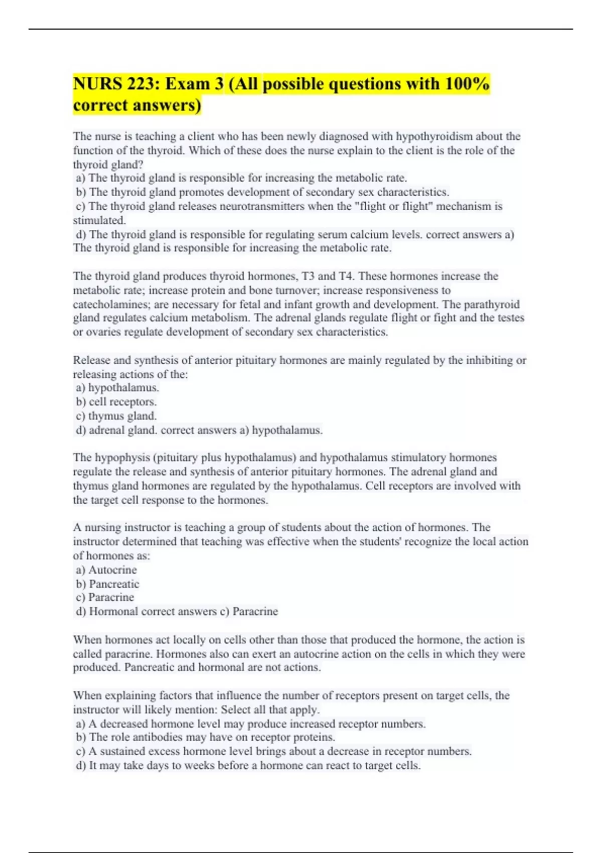 The nurse is teaching a client who has been newly diagnosed with hypothyroidism about the function of the thyroid. Which of these does the nurse explain to the client is the role of the thyroid gland? a) The thyroid gland is responsible for increasing the metabolic rate. b) The thyroid gland promotes development of secondary sex characteristics. c) The thyroid gland releases neurotransmitters when the "flight or flight" mechanism is stimulated. d) The thyroid gland is responsible for regulating serum calcium levels. correct answers a) The thyroid gland is responsible for increasing the metabolic rate. The thyroid gland produces thyroid hormones, T3 and T4. These hormones increase the metabolic rate; increase protein and bone turnover; increase responsiveness to catecholamines; are necessary for fetal and infant growth and development. The parathyroid gland regulates calcium metabolism. The adrenal glands regulate flight or fight and the testes or ovaries regulate development of secondary sex characteristics. Release and synthesis of anterior pituitary hormones are mainly regulated by the inhibiting or releasing actions of the: a) hypothalamus. b) cell receptors. c) thymus gland. d) adrenal gland. correct answers a) hypothalamus. The hypophysis (pituitary plus hypothalamus) and hypothalamus stimulatory hormones regulate the release and synthesis of anterior pituitary hormones. The adrenal gland and thymus gland hormones are regulated by the hypothalamus. Cell receptors are involved with the target cell response to the hormones. A nursing instructor is teaching a group of students about the action of hormones. The instructor determined that teaching was effective when the students' recognize the local action of hormones as: a) Autocrine b) Pancreatic c) Paracrine d) Hormonal correct answers c) Paracrine When hormones act locally on cells other than those that produced the hormone, the action is called paracrine. Hormones also can exert an autocrine action on the cells in which they were produced. Pancreatic and hormonal are not actions. When explaining factors that influence the number of receptors present on target cells, the instructor will likely mention: Select all that apply. a) A decreased hormone level may produce increased receptor numbers. b) The role antibodies may have on receptor proteins. c) A sustained excess hormone level brings about a decrease in receptor numbers. d) It may take days to weeks before a hormone can react to target cells.