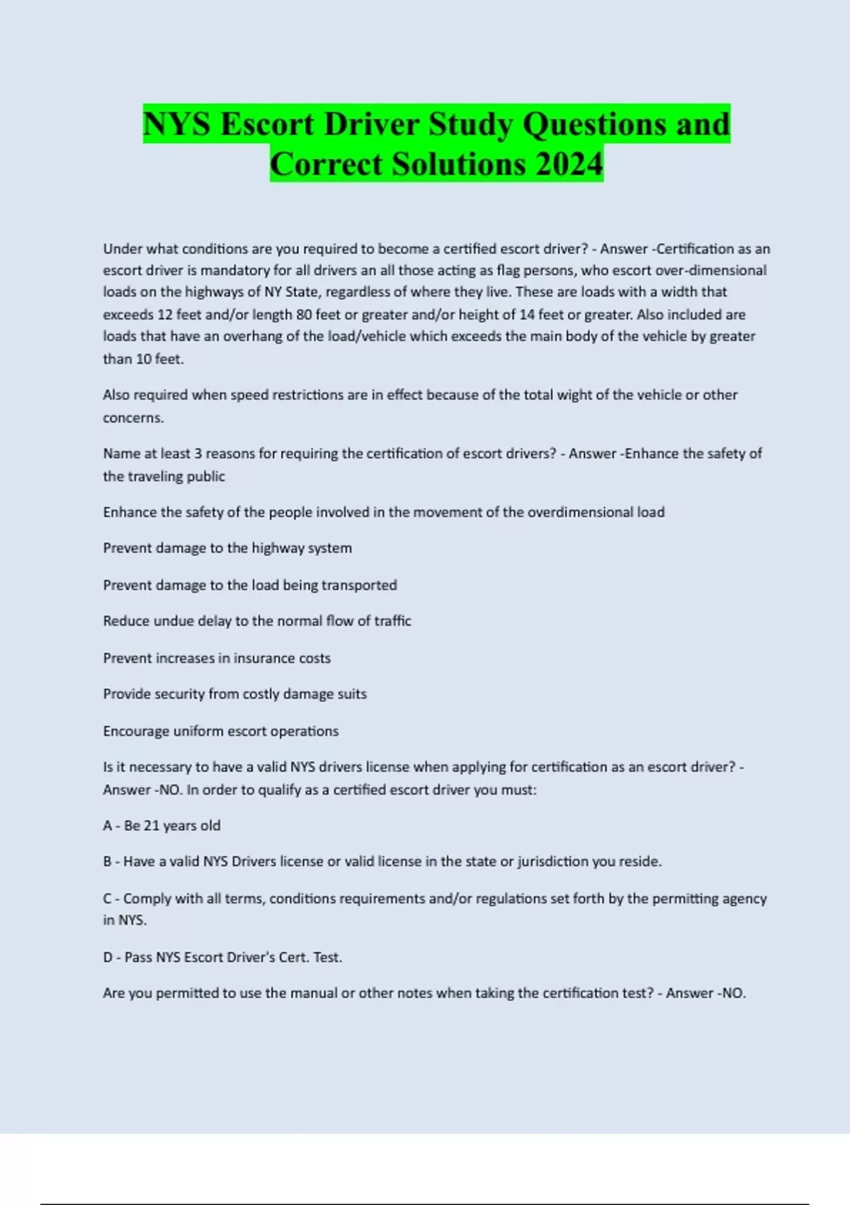 NYS Escort Driver Study Questions and Correct Solutions 2024 Under what conditions are you required to become a certified escort driver? - Answer -Certification as an escort driver is mandatory for all drivers an all those acting as flag persons, who escort over-dimensional loads on the highways of NY State, regardless of where they live. These are loads with a width that exceeds 12 feet and/or length 80 feet or greater and/or height of 14 feet or greater. Also included are loads that have an overhang of the load/vehicle which exceeds the main body of the vehicle by greater than 10 feet. Also required when speed restrictions are in effect because of the total wight of the vehicle or other concerns. Name at least 3 reasons for requiring the certification of escort drivers? - Answer -Enhance the safety of the traveling public Enhance the safety of the people involved in the movement of the overdimensional load Prevent damage to the highway system Prevent damage to the load being transported Reduce undue delay to the normal flow of traffic Prevent increases in insurance costs Provide security from costly damage suits Encourage uniform escort operations Is it necessary to have a valid NYS drivers license when applying for certification as an escort driver? - Answer -NO. In order to qualify as a certified escort driver you must: A - Be 21 years old