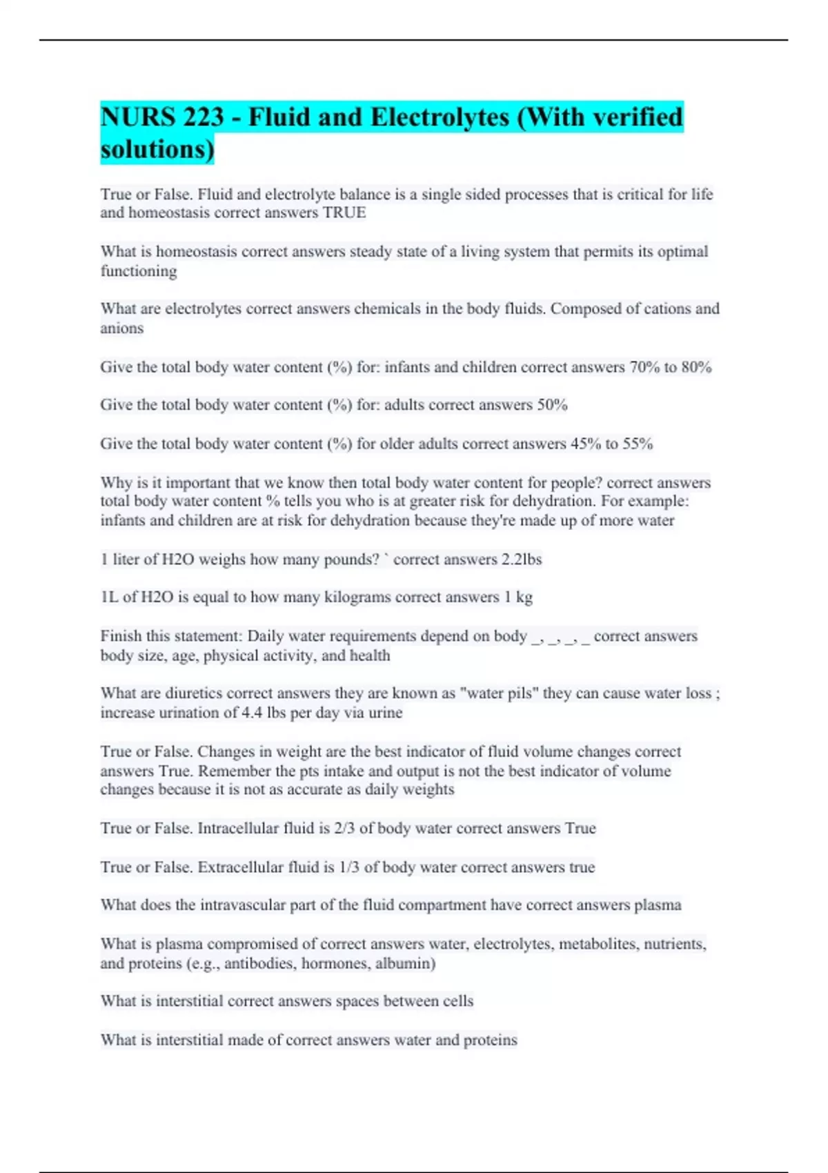NURS 223 - Fluid and Electrolytes (With verified solutions)