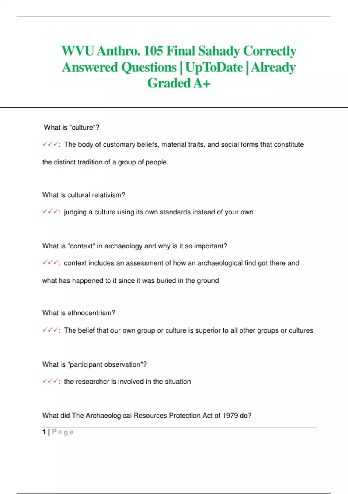 WVU Anthro. 105 Final Sahady Correctly Answered Questions| UpToDate | Already Graded A+