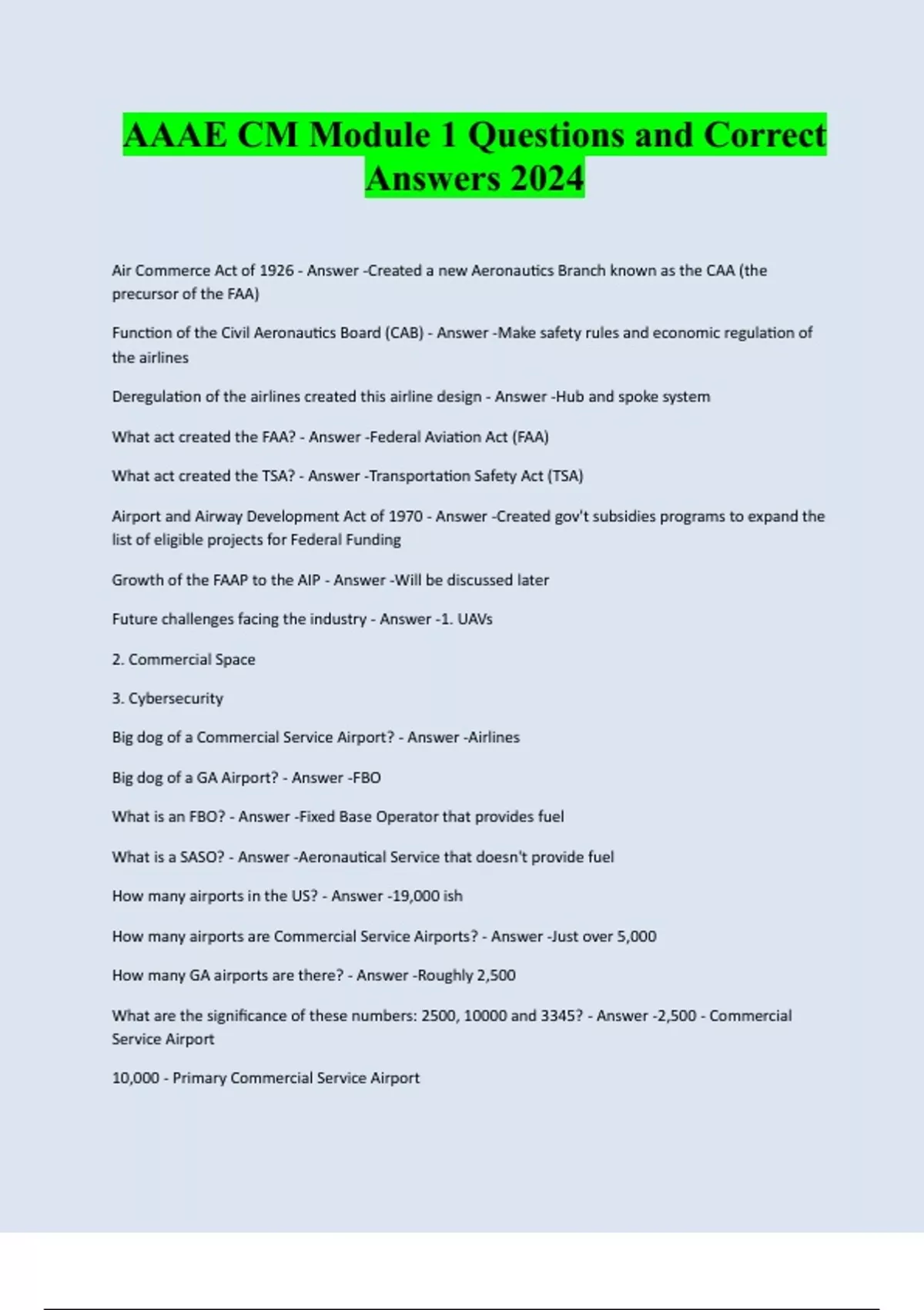 AAAE CM Module 1 Questions and Correct Answers 2024 Air Commerce Act of 1926 - Answer -Created a new Aeronautics Branch known as the CAA (the precursor of the FAA) Function of the Civil Aeronautics Board (CAB) - Answer -Make safety rules and economic regulation of the airlines Deregulation of the airlines created this airline design - Answer -Hub and spoke system What act created the FAA? - Answer -Federal Aviation Act (FAA) What act created the TSA? - Answer -Transportation Safety Act (TSA) Airport and Airway Development Act of 1970 - Answer -Created gov't subsidies programs to expand the list of eligible projects for Federal Funding Growth of the FAAP to the AIP - Answer -Will be discussed later Future challenges facing the industry - Answer -1. UAVs 2. Commercial Space 3. Cybersecurity Big dog of a Commercial Service Airport? - Answer -Airlines Big dog of a GA Airport? - Answer -FBO What is an FBO? - Answer -Fixed Base Operator that provides fuel What is a SASO? - Answer -Aeronautical Service that doesn't provide fuel How many airports in the US? - Answer -19,000 ish How many airports are Commercial Service Airports? - Answer -Just over 5,000 How many GA airports are there? - Answer -Roughly 2,500 What are the significance of these numbers: 2500, 10000 and 3345? - Answer -2,500 - Commercial Service Airport 10,000 - Primary Commercial Service A