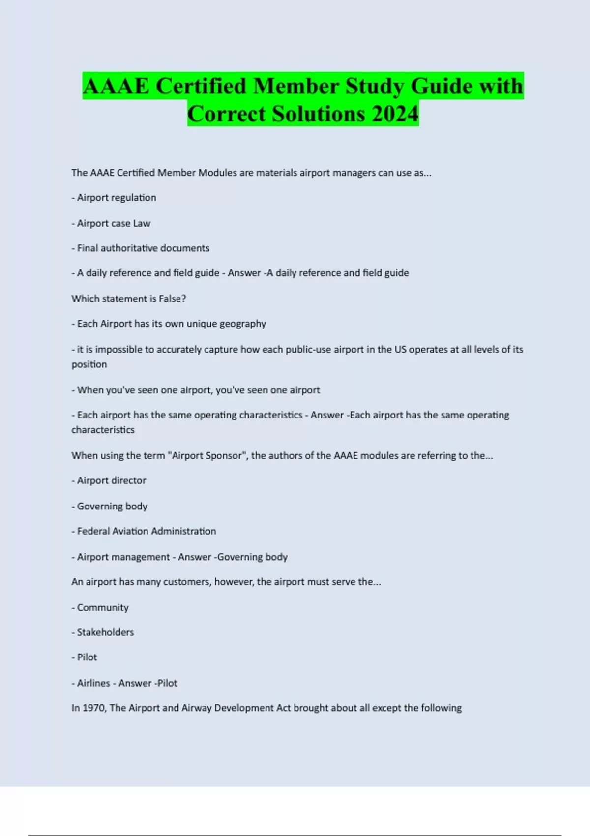 AAAE Certified Member Study Guide with Correct Solutions 2024 The AAAE Certified Member Modules are materials airport managers can use as... - Airport regulation - Airport case Law - Final authoritative documents - A daily reference and field guide - Answer -A daily reference and field guide Which statement is False? - Each Airport has its own unique geography - it is impossible to accurately capture how each public-use airport in the US operates at all levels of its position - When you've seen one airport, you've seen one airport - Each airport has the same operating characteristics - Answer -Each airport has the same operating characteristics When using the term "Airport Sponsor", the authors of the AAAE modules are referring to the... - Airport director - Governing body - Federal Aviation Administration - Airport management - Answer -Governing body An airport has many customers, however, the airport must serve the... - Community - Stakeholders - Pilot - Airlines - Answer -Pilot In 1970, The Airport and Airway Development Act brought about all except the following- Airport and Airway Trust Fund - Planning Grant Program (PGP) - Airport Development Aid Program (ADAP) - National Plan of Integrated Airport Systems (NPIAS) - Answer -National Plan of Integrated Airport Systems (NPIAS) (T/F) The FAA does not include in its planning or funding decision-making any private airports unless they are publicly accessible or military airports that do not host any civilian operations. - Answer -True The National Plan of integrated Airport Systems (NPIAS) ide