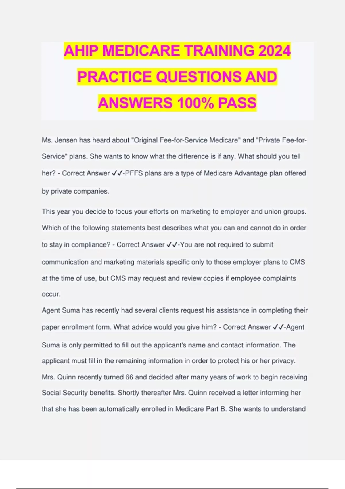 AHIP MEDICARE TRAINING 2024 PRACTICE QUESTIONS AND ANSWERS 100% PASS Ms. Jensen has heard about "Original Fee-for-Service Medicare" and "Private Fee-for- Service" plans. She wants to know what the difference is if any. What should you tell her? - Correct Answer ️️ -PFFS plans are a type of Medicare Advantage plan offered by private companies. This year you decide to focus your efforts on marketing to employer and union groups. Which of the following statements best describes what you can and cannot do in order to stay in compliance? - Correct Answer ️️ -You are not required to submit communication and marketing materials specific only to those employer plans to CMS at the time of use, but CMS may request and review copies if employee complaints occur. Agent Suma has recently had several clients request his assistance in completing their paper enrollment form. What advice would you give him? - Correct Answer ️️ -Agent Suma is only permitted to fill out the applicant's name and contact information. The applicant must fill in the remaining information in order to protect his or her privacy. Mrs. Quinn recently turned 66 and decided after many years of work to begin receiving Social Security benefits. Shortly thereafter Mrs. Quinn received a letter informing her that she has been automatically enrolled in Medicare Part B. She wants to understand what this means. What should you tell Mrs. Quinn? - Correct Answer ️️ -Part B primarily covers physician services. She will be paying a monthly premium and, with the exception of many preventive and screening tests, generally will have 20% coinsurance for these services, in addition to an annual deductible. Mrs. Turner is comparing her employer's retiree insurance to Original Medicare and would like to know which of the following services Original Medicare will cover if the appropriate criteria are met? What could you tell her? - Correct Answer ️️ -Original Medicare covers ambulance services. Mr. Diaz continued working with his company and was insured under his employer's group plan until he reached age 68. He has heard that there is a premium penalty for those who did not sign up for Part B when first eligible and wants to know how much he will have to pay. What should you tell him? - Correct Answer ️️ -Mr. Diaz will not pay any penalty because he had continuous coverage under his employer's plan. Anita Magri will turn age 65 in August 2020. Anita intends to enroll in Original Medicare Part A and Part B. She would also like to enroll in a Medicare Supplement (Medigap) plan. Anita's older neighbor Mel has told her about the Medigap Part F plan in which he is enrolled. It not only provides foreign travel emergency benefits but also covers his Medicare Part B deductible. Anita comes to you for advice. What should you tell her - Correct Answer ️️ -You are sorry to disappoint Anita but a Medigap Part F plan is no longer available to those who turn age 65 after January 1,2020. Anita might instead consider other Medigap plans that offer foreign travel benefits but do not cover the Part B deductible. Mr. Moy's wife has a Medicare Advantage plan, but he wants to understand what coverage Medicare Supplemental Insurance provides since his health care needs are different from his wife's needs. What could you tell Mr. Moy? - Correct Answer ️️ - Medicare Supplemental Insurance would help cover his Part A and Part B cost sharing in Original Fee-for-Service (FFS) Medicare as well as possibly some services that Medicare does not cover. Mr. Bauer is 49 years old, but eighteen months ago he was declared disabled by the Social Security Administration and has been receiving disability payments. He is wondering whether he can obtain coverage under Medicare. What should you tell him? - Correct Answer ️️ -After receiving such disability payments for 24 months, he will be automatically enrolled in Medicare, regardless of age. Mr. Schmidt would like to plan for retirement and has asked you what is covered under Original Fee-for-Service (FFS) Medicare? What could you tell him? - Correct Answer ️️ -Part A, which covers hospital, skilled nursing facility, hospice, and home health services and Part B, which covers professional services such as those provided by a doctor are covered under Original Medicare. Ms. Moore plans to retire when she turns 65 in a few months. She is in excellent health and will have considerable income when she retires. She is concerned that her income will make it impossible for her to qualify for Medicare. What could you tell her to address her concern? - Correct Answer ️️ -Medicare is a program for people age 65 or older and those under age 65 with certain disabilities, end-stage renal disease, and Lou Gehrig's disease so she will be eligible for Medicare. Mrs. Shields is covered by Original Medicare. She sustained a hip fracture and is being successfully treated for that condition. However, she and her physicians feel that after her lengthy hospital stay she will need a month or two of nursing and rehabilitative care. What should you tell them about Original Medicare's coverage of care in a skilled nursing facility? - Correct Answer ️️ -Medicare will cover Mrs. Shield's skilled nursing services provided during the first 20 days of her stay, after which she would have a copay until she has been in the facility for 100 days. Mr. Xi will soon turn age 65 and has come to you for advice as to what services are provided under Original Medicare. What should you tell Mr. Xi that best describes the health coverage provided to Medicare beneficiaries? - Correct Answer ️️ -Beneficiaries under Original Medicare have no cost-sharing for most preventive services which include immunizations such as annual flu shots. Mrs. Geisler's neighbor told her she should look at her Part D options during the an