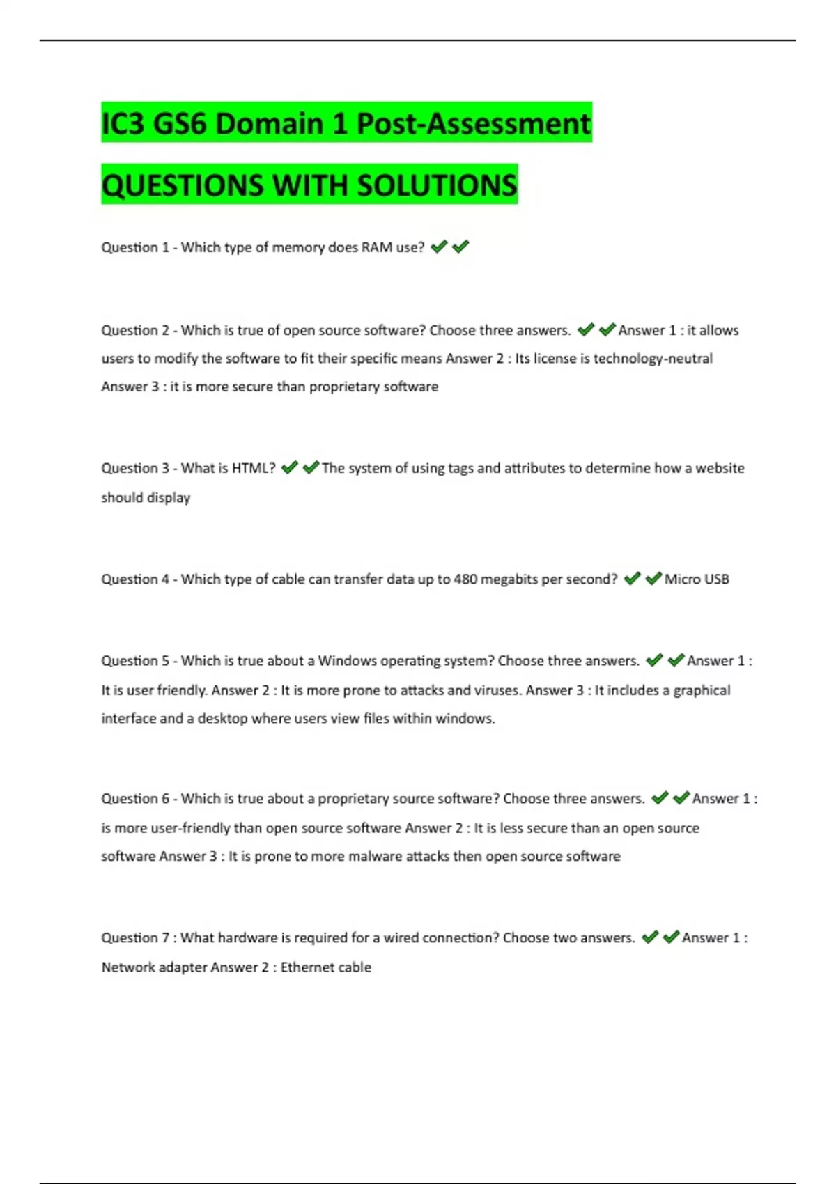 Question 1 - Which type of memory does RAM use? Question 2 - Which is true of open source software? Choose three answers. Answer 1 : it allows users to modify the software to fit their specific means Answer 2 : Its license is technology-neutral Answer 3 : it is more secure than proprietary software Question 3 - What is HTML? The system of using tags and attributes to determine how a website should display Question 4 - Which type of cable can transfer data up to 480 megabits per second? Micro USB
