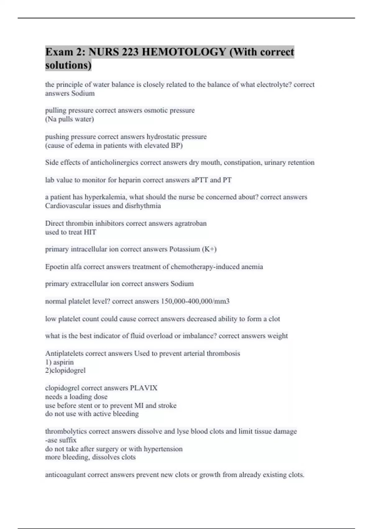 Exam 2: NURS 223 HEMOTOLOGY (With correct solutions)