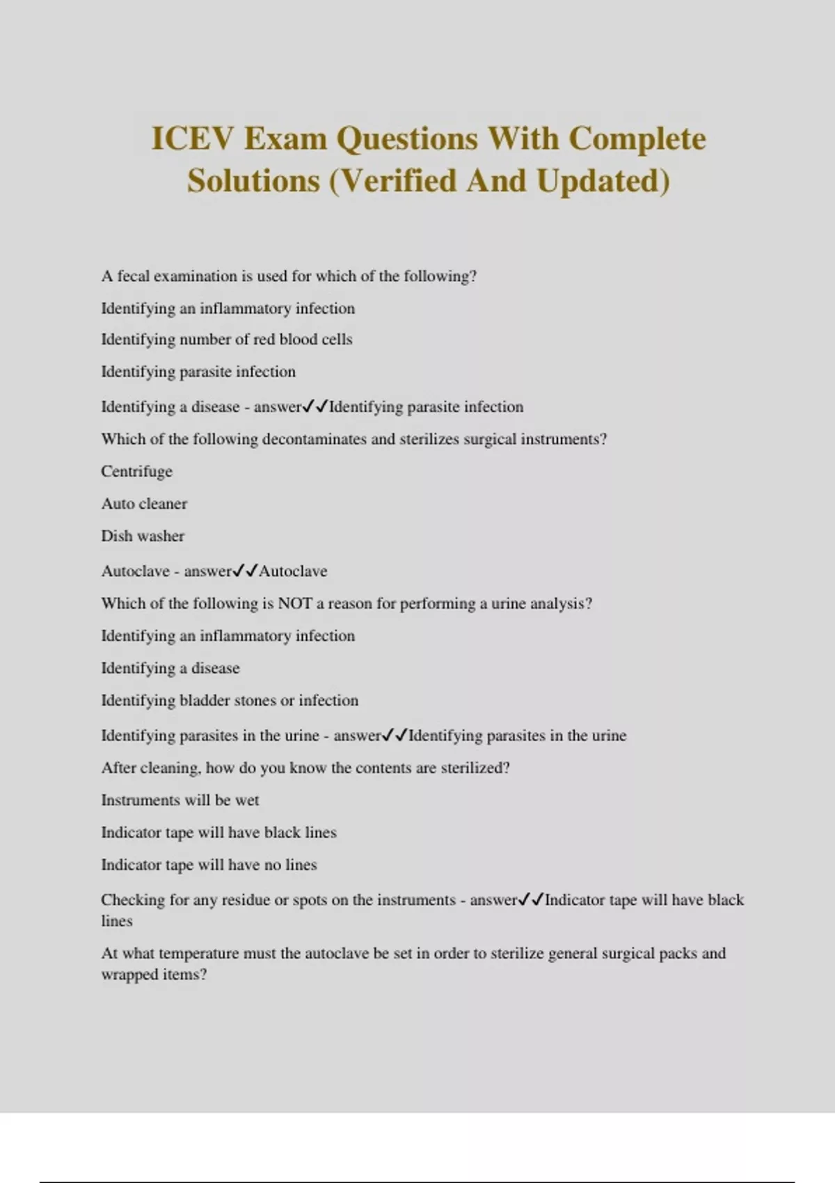 ICEV Exam Questions With Complete Solutions (Verified And Updated) A fecal examination is used for which of the following? Identifying an inflammatory infection Identifying number of red blood cells Identifying parasite infection Identifying a disease - answerIdentifying parasite infection Which of the following decontaminates and sterilizes surgical instruments? Centrifuge Auto cleaner Dish washer Autoclave - answerAutoclave Which of the following is NOT a reason for performing a urine analysis? Identifying an inflammatory infection Identifying a disease Identifying bladder stones or infection Identifying parasites in the urine - answerIdentifying parasites in the urine After cleaning, how do you know the contents are sterilized? Instruments will be wet Indicator tape will have black lines Indicator tape will have no lines Checking for any residue or spots on the instruments - answerIndicator tape will have black lines At what temperature must the autoclave be set in order to sterilize general surgical packs and wrapped items? 500°F (260°C) 300°F (149°C) 250°F (121°C) 200°F (93°C) - answer250°F (121°C) Which of the following detects heart disease or an irregular heart beat? Endoscope Ultrasound Electrocardiograph Radiograp - answerElectrocardiograph What is used to detect a fetus in a pregnant animal? Endoscope X-ray Radiograph Ultrasound - answerUltrasound What should a veterinarian or staff always wear when using a radiograph (x-ray) machine? A mask Latex gloves and gown Sterilized suit Lead gloves and lead apron - answerLead gloves and lead apron Which of the following examines the esophagus, stomach, rectum, bowel, colon, cecum and upper intestines? Radiograph Endoscope Electrocardiograph Ultrasound - answerEndoscope Which of the following is also known as an ECG or EKG? Radiograph Electrocardiograph