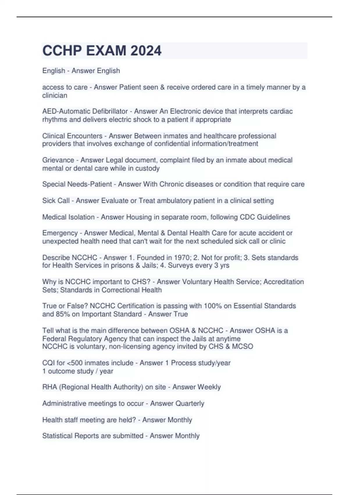 English - Answer English access to care - Answer Patient seen & receive ordered care in a timely manner by a clinician AED-Automatic Defibrillator - Answer An Electronic device that interprets cardiac rhythms and delivers electric shock to a patient if appropriate Clinical Encounters - Answer Between inmates and healthcare professional providers that involves exchange of confidential information/treatment Grievance - Answer Legal document, complaint filed by an inmate about medical mental or dental care while in custody Special Needs-Patient - Answer With Chronic diseases or condition that require care Sick Call - Answer Evaluate or Treat ambulatory patient in a clinical setting Medical Isolation - Answer Housing in separate room, following CDC Guidelines Emergency - Answer Medical, Mental & Dental Health Care for acute accident or unexpected health need that can't wait for the next scheduled sick call or clinic Describe NCCHC - Answer 1. Founded in 1970; 2. Not for profit; 3. Sets standards for Health Services in prisons & Jails; 4. Surveys every 3 yrs Why is NCCHC important to CHS? - Answer Voluntary Health Service; Accreditation Sets; Standards in Correctional Health