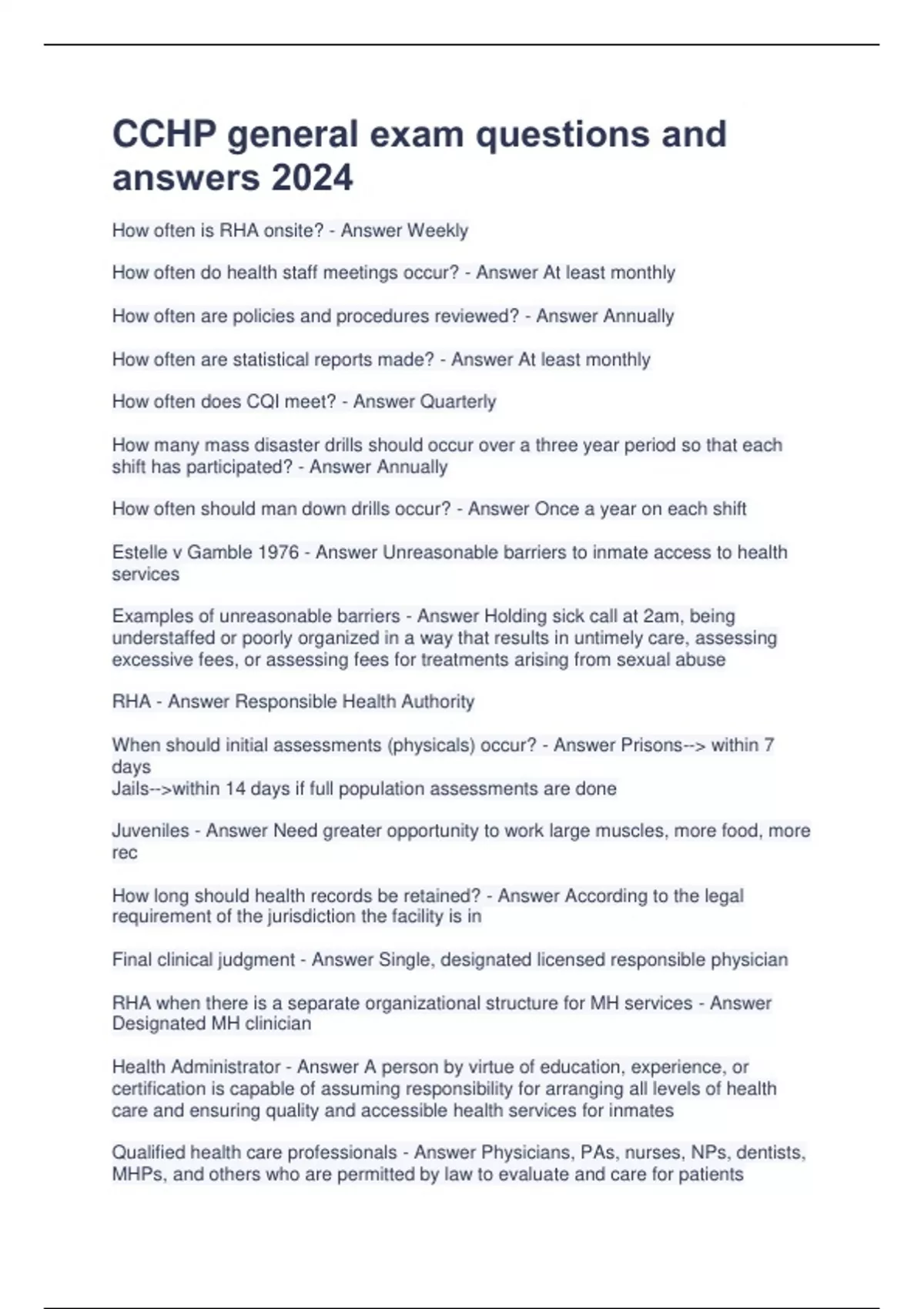 How often is RHA onsite? - Answer Weekly How often do health staff meetings occur? - Answer At least monthly How often are policies and procedures reviewed? - Answer Annually How often are statistical reports made? - Answer At least monthly How often does CQI meet? - Answer Quarterly How many mass disaster drills should occur over a three year period so that each shift has participated? - Answer Annually How often should man down drills occur? - Answer Once a year on each shift Estelle v Gamble 1976 - Answer Unreasonable barriers to inmate access to health services Examples of unreasonable barriers - Answer Holding sick call at 2am, being understaffed or poorly organized in a way that results in untimely care, assessing excessive fees, or assessing fees for treatments arising from sexual abuse RHA - Answer Responsible Health Authority When should initial assessments (physicals) occur? - Answer Prisons--> within 7 days Jails-->within 14 days if full population assessments are done Juveniles - Answer Need greater opportunity to work large muscles, more food, more rec How long should health records be retained? - Answer According to the legal requirement of the jurisdiction the facility is in Final clinical judgment - Answer Single, designated licensed responsible physician RHA when there is a separate organizational structure for MH services - Answer Designated MH clinician Health Administrator - Answer A person by virtue of education, experience, or certification is capable of assuming responsibility for arranging all levels of health care and ensuring quality and accessible health services for inmates Qualified health care professionals - Answer Physicians, PAs, nurses, NPs, dentists, MHPs, and others who are permitted by law to evaluate and care for patientsHealth care liaison - Answer Correction officer or other person without a health care license who is trained/instructed by the responsible physician in limited aspects of health care coordination and coordinates services on days when no qualified health care professionals are available for 24 hours Examples of interference with medical autonomy - Answer Cancellation of scheduled community consultants' appointments, discontinuance of necessary medical diets without QHP approval Policy - Answer Official position on a particular issue related to operations Procedure - Answer Describes in detail how a policy is to be carried out How often are health care polices and procedures reviewed? - Answer At least annually, signed by the RHA