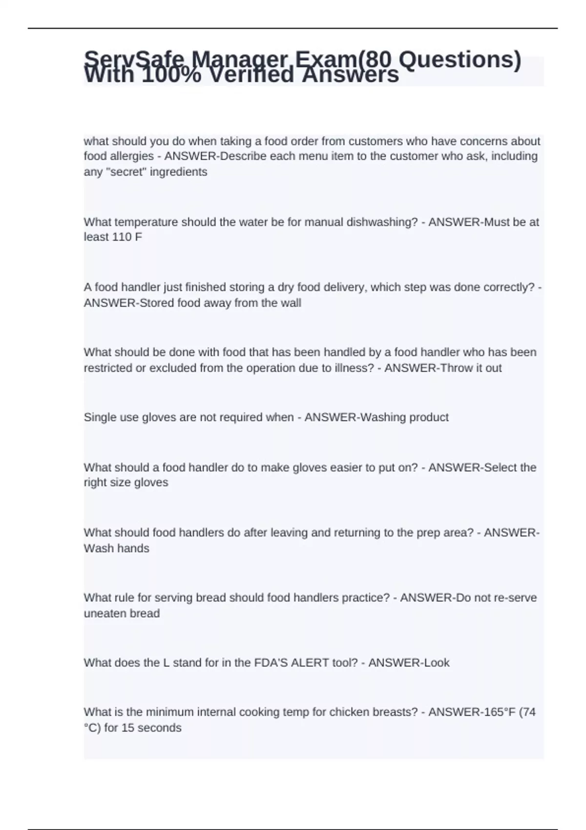 what should you do when taking a food order from customers who have concerns about food allergies - ANSWER-Describe each menu item to the customer who ask, including any "secret" ingredients What temperature should the water be for manual dishwashing? - ANSWER-Must be at least 110 F A food handler just finished storing a dry food delivery, which step was done correctly? - ANSWER-Stored food away from the wall What should be done with food that has been handled by a food handler who has been restricted or excluded from the operation due to illness? - ANSWER-Throw it out Single use gloves are not required when - ANSWER-Washing product What should a food handler do to make gloves easier to put on? - ANSWER-Select the right size gloves What should food handlers do after leaving and returning to the prep area? - ANSWER-Wash hands What rule for serving bread should food handlers practice? - ANSWER-Do not re-serve uneaten bread What does the L stand for in the FDA'S ALERT tool? - ANSWER-Look