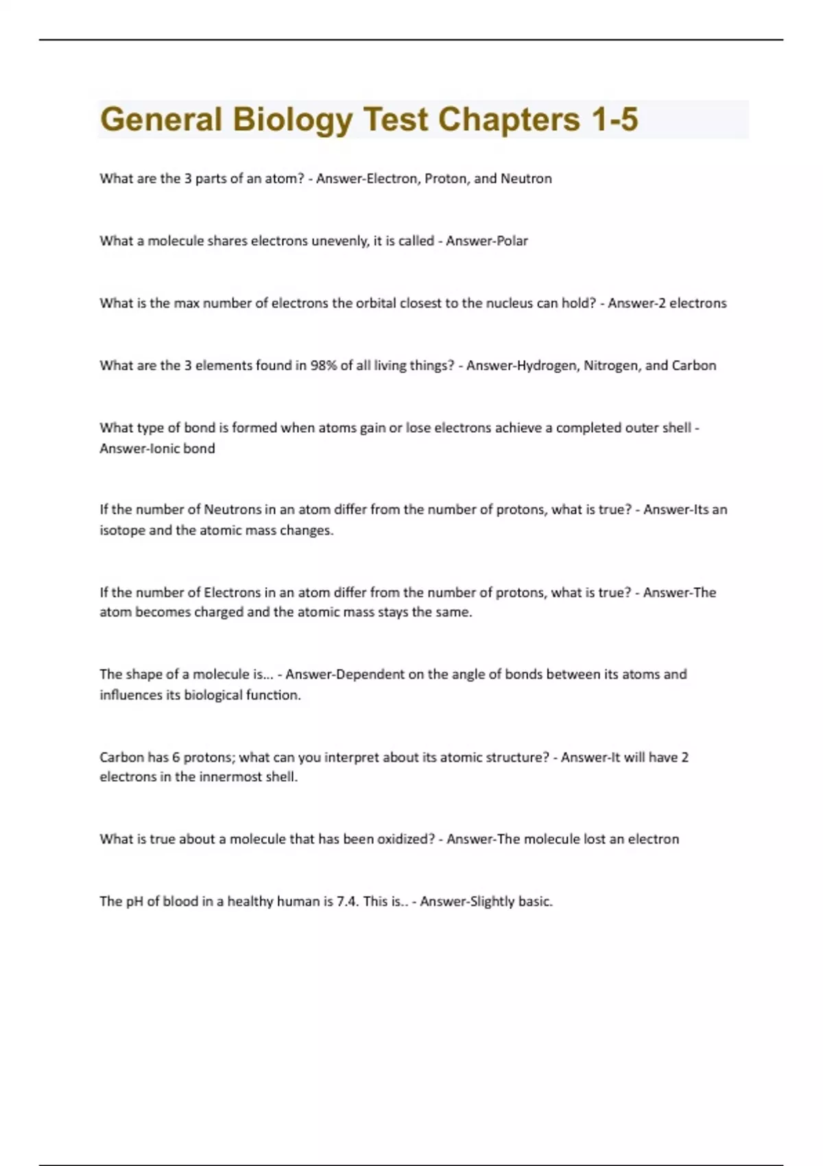 What are the 3 parts of an atom? - Answer-Electron, Proton, and Neutron What a molecule shares electrons unevenly, it is called - Answer-Polar What is the max number of electrons the orbital closest to the nucleus can hold? - Answer-2 electrons What are the 3 elements found in 98% of all living things? - Answer-Hydrogen, Nitrogen, and Carbon What type of bond is formed when atoms gain or lose electrons achieve a completed outer shell - Answer-Ionic bond If the number of Neutrons in an atom differ from the number of protons, what is true? - Answer-Its an isotope and the atomic mass changes. If the number of Electrons in an atom differ from the number of protons, what is true? - Answer-The atom becomes charged and the atomic mass stays the same. The shape of a molecule is... - Answer-Dependent on the angle of bonds between its atoms and influences its biological function. Carbon has 6 protons; what can you interpret about its atomic structure? - Answer-It will have 2 electrons in the innermost shell. What is true about a molecule that has been oxidized? - Answer-The molecule lost an electron The pH of blood in a healthy human is 7.4. This is.. - Answer-Slightly basic.What 3 things are true about buffers? - Answer-Example on how the body maintains homeostasis, They resist changes in pH by absorbing hydrogen ions when acids are added, and they also resist changes in pH by releasing hydrogen ions when bases are added. Out of the 4 options, which would have the greatest concentration of hydrogen ions? - Answer-Lemon Juice. Describe hydrogen bonds. - Answer-They are indicated by dotted lines between molecules and are weak and transient. Where is the majority of energy in carbohydrates stored? - Answer-in C-H bonds. What domain includes oak trees? - Answer-Eukarya What does the call theory state? - Answer-All living things are made of cells