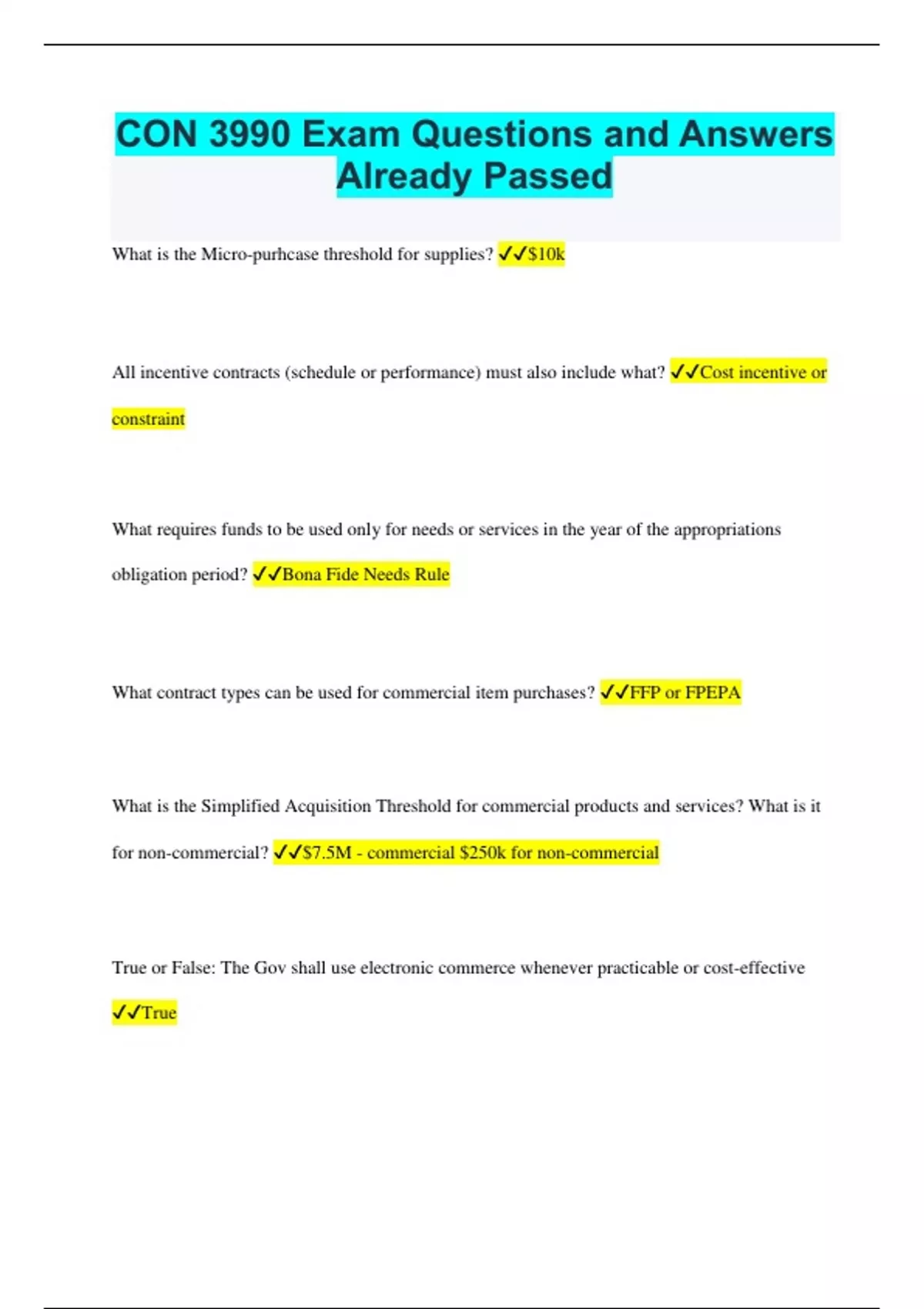 CON 3990 Exam Questions and Answers Already Passed What is the Micro-purhcase threshold for supplies? $10k All incentive contracts (schedule or performance) must also include what? Cost incentive or constraint What requires funds to be used only for needs or services in the year of the appropriations obligation period? Bona Fide Needs Rule What contract types can be used for commercial item purchases? FFP or FPEPA What is the Simplified Acquisition Threshold for commercial products and services? What is it for non-commercial? $7.5M - commercial $250k for non-commercial True or False: The Gov shall use electronic commerce whenever practicable or cost-effective True What is the purpose of a contract file? (4) Provide background/basis for decisions Supporting actions taken Provide information for reviews and investigations Furnishing essential facts in the event of a litigation Can contract files be combined if appropriate? Yes At what level are contract files maintained and why? Maintained at the organizational level to ensure effective documentation of contract actions accessibility by principal users minimal establishment of duplicate and working files safeguarding classified docs conformance with agency regs When is a SAP contract file closed out? When the KO receives evidence of receipt of property or final payment When is a FFP (not SAP) contract file closed out? Should be closed out within 6 months after date KO receives evidence of physical completion When should contract files required settlement of indirect cost rates be closed out? Within 36 months of the month the KO receives evidence of physical completion When should all other (not SAP, FFP, or indirect cost rate) contract files be closed? Within 20 months of the month the KO receives evidence of physical completion When is a contract considered physically complete? the KTR has completed required deliveries and Gov has inspected and accepted the supplies The contractor has performed all services and the Gov has accepted the services and all option provisions, if any, have expired or the Gov gives the KTR notice of termination What are the steps to close out a contract file? 1) Contract admin office is responsible for initiating, reviewing contract fund status, and deobligating excess funds 2)KO issues a contract completions statement 3) KO files completed statement and signed