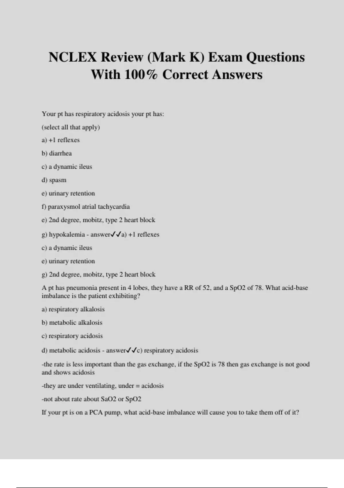 NCLEX Review (Mark K) Exam Questions With 100% Correct Answers Your pt has respiratory acidosis your pt has: (select all that apply) a) +1 reflexes b) diarrhea c) a dynamic ileus d) spasm e) urinary retention f) paraxysmol atrial tachycardia e) 2nd degree, mobitz, type 2 heart block g) hypokalemia - answera) +1 reflexes c) a dynamic ileus e) urinary retention g) 2nd degree, mobitz, type 2 heart block A pt has pneumonia present in 4 lobes, they have a RR of 52, and a SpO2 of 78. What acid-base imbalance is the patient exhibiting? a) respiratory alkalosis b) metabolic alkalosis c) respiratory acidosis d) metabolic acidosis - answerc) respiratory acidosis -the rate is less important than the gas exchange, if the SpO2 is 78 then gas exchange is not good and shows acidosis -they are under ventilating, under = acidosis -not about rate about SaO2 or SpO2 If your pt is on a PCA pump, what acid-base imbalance will cause you to take them off of it? a) respiratory alkalosis b) metabolic alkalosis c) respiratory acidosis d) metabolic acidosis - answerc) respiratory acidosis -PCA pumps depress respirations = underventilation If your male pt comes in with hyper-emesis what acid-base imbalance would he have? a) respiratory alkalosis b) metabolic alkalosis c) respiratory acidosis d) metabolic acidosis - answerb) metabolic alkalosis -vomiting or suctioning = met alkalosis -losing acid If a male pt comes in with prolonged hyper-emesis that has lead to dehydration what acid-base imbalance would they have? a) respiratory alkalosis b) metabolic alkalosis c) respiratory acidosis d) metabolic acidosis - answerd) metabolic acidosis -even though the pt is vomiting, they are now dehydrated which is the main take away from the question, dehydration = acidosis If an infant comes in with diarrhea, what acid-base imbalance is anticipated? a) respiratory alkalosis b) metabolic alkalosis c) respiratory acidosis d) metabolic acidosis - answerd) metabolic acidosis -diarrhea is not vomiting or suctioning so it is not alkalosis -diarrhea leads to dehydration = acidosis If your pt is in kidney failure, what acid-base imbalance do you expect to see? a) respiratory alkalosis b) metabolic alkalosis c) respiratory acidosis d) metabolic acidosis - answerd) metabolic acidosis -not a lung issue -not due to vomiting or suctioning If a pt has third degree (full thickness) burns over 60% of their body in the first phase, what acid- base imbalance do you expect to see? a) respiratory alkalosis b) metabolic alkalosis c) respiratory acidosis d) metabolic acidosis - answerd) metabolic acidosis -not a lung issue -not due to vomiting or suctioning How often do you suction pts? a) every 2 hrs b) every 15 min c) every hour d) every 4 hours e) none of the above - answere) none of the above -suction as needed only -suctioning is a double edge sword, the more your suction the more secretions are produced You have a type 2 DM, what is the best dietary route to take? a) restrict their calories b) divide their food into 6 feeding/day - answera) restrict their calories **both are needed but since this is a "best" question this is the best option A young boy with type one diabetes comes into the E.R. with a blood glucose of 800, what is the best question to ask his parents to determine the cause of the DKA? a) Has your child be involved in high activity today? b) Did your child have an extra dose of insulin today? c) Has your child had an URI in the last two weeks? d) Did your child skip a meal today? - answerc) Has your child had an URI in the last two weeks? **(A) is correct but not the BEST answer, the most common cause of DKA is upper respiratory infection --the stress of the illness causes the body to break down fats, leading to ketones --need to confirm with ketones in the blood, ketonuria can be present without DKA so this is not diagnostic In what position should you put an opisthotonus baby? a) side b) prone c) supine d) head elevated (sitting) - answera) side **opisthotonus is a hyperextention of the neck and back and can occur when an elevated bilirubin passes the BBB of a baby --important to report immediately as its a sign of impending kernicterus Your Pt has hyperkalemia, select all that apply: a) dynamic ileus b) obtundant c) +1 reflex d) clonus e) u wave f) depressed ST g) polyuria h) bradycardia - answerd) clonus h) bradycardia