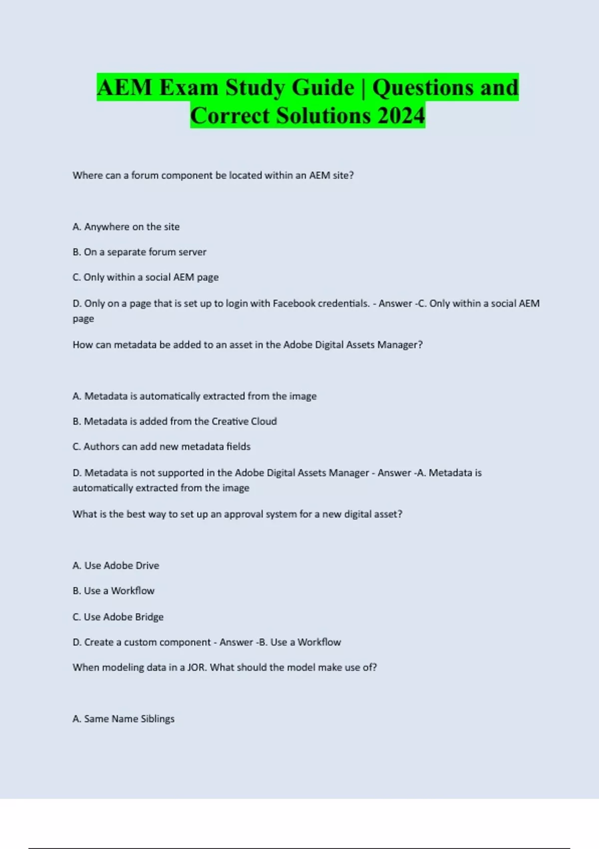AEM Exam Study Guide | Questions and Correct Solutions 2024 Where can a forum component be located within an AEM site? A. Anywhere on the site B. On a separate forum server C. Only within a social AEM page D. Only on a page that is set up to login with Facebook credentials. - Answer -C. Only within a social AEM page How can metadata be added to an asset in the Adobe Digital Assets Manager? A. Metadata is automatically extracted from the image B. Metadata is added from the Creative Cloud C. Authors can add new metadata fields D. Metadata is not supported in the Adobe Digital Assets Manager - Answer -A. Metadata is automatically extracted from the image What is the best way to set up an approval system for a new digital asset? A. Use Adobe Drive B. Use a Workflow C. Use Adobe Bridge D. Create a custom component - Answer -B. Use a Workflow When modeling data in a JOR. What should th