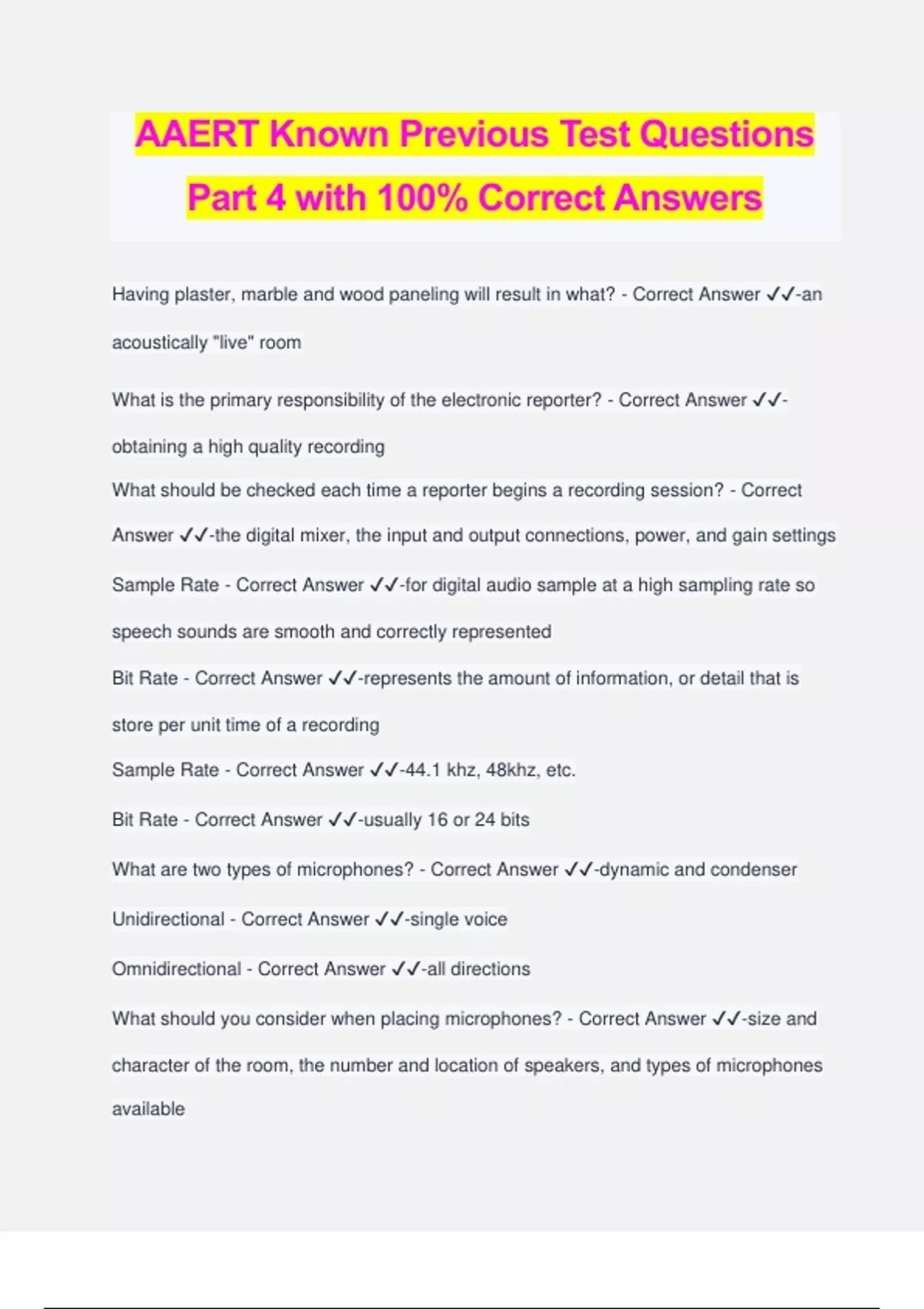 AAERT Known Previous Test Questions Part 4 with 100% Correct Answers Having plaster, marble and wood paneling will result in what? - Correct Answer ️️ -an acoustically "live" room What is the primary responsibility of the electronic reporter? - Correct Answer ️️ - obtaining a high quality recording What should be checked each time a reporter begins a recording session? - Correct Answer ️️ -the digital mixer, the input and output connections, power, and gain settings Sample Rate - Correct Answer ️️ -for digital audio sample at a high sampling rate so speech sounds are smooth and correctly represented Bit Rate - Correct Answer ️️ -represents the amount of information, or detail that is store per unit time of a recording