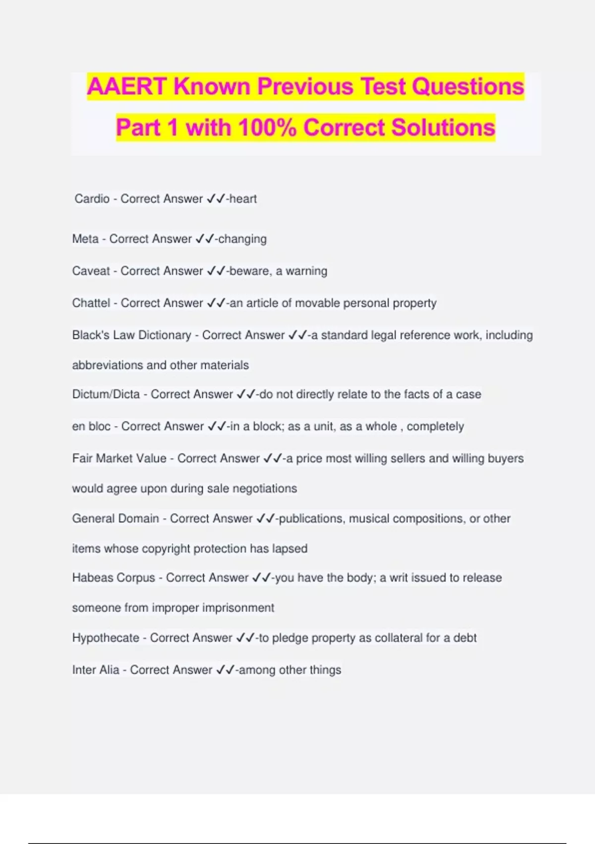 AAERT Known Previous Test Questions Part 1 with 100% Correct Solutions Cardio - Correct Answer ️️ -heart Meta - Correct Answer ️️ -changing Caveat - Correct Answer ️️ -beware, a warning Chattel - Correct Answer ️️ -an article of movable personal property Black's Law Dictionary - Correct Answer ️️ -a standard legal reference work, including abbreviations and other materials Dictum/Dicta - Correct Answer ️️ -do not directly relate to the facts of a case en bloc - Correct Answer ️️ -in a block; as a unit, as a whole , completely Fair Market Value - Correct Answer ️️ -a price most willing sellers and willing buyers would agree upon during sale negotiations General Domain - Correct Answer ️️ -publications, musical compositions, or other items whose copyright protection has lapsed