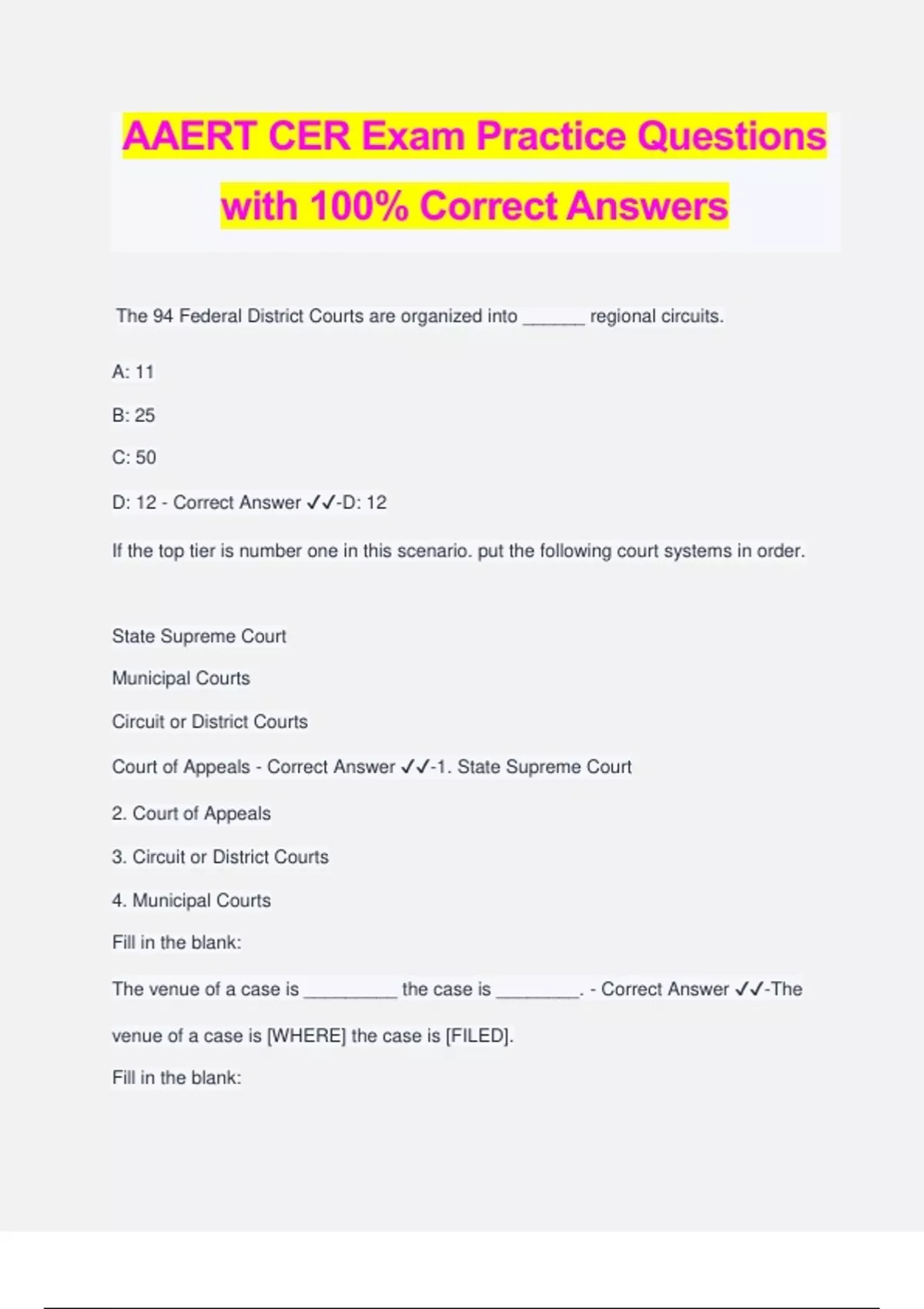 AAERT CER Exam Practice Questions with 100% Correct Answers The 94 Federal District Courts are organized into ______ regional circuits. A: 11 B: 25 C: 50 D: 12 - Correct Answer ️️ -D: 12 If the top tier is number one in this scenario. put the following court systems in order. State Supreme Court Municipal Courts Circuit or District Courts Court of Appeals - Correct Answer ️️ -1. State Supreme Court 2. Court of Appeals 3. Circuit or District Courts 4. Municipal Courts Fill in the blank: The venue of a case is _________ the case is ________. - Correct Answer ️️ -The venue of a case is [WHERE] the case is [FILED]. Fill in the blank: The three types of courts ________ courts, which have been around the longest; ________ courts, which includes the United States Tax Court, and the _______ Court, which is the third branch of the federal government and includes the Circuit Courts of Appeal. - Correct Answer ️️ -The three types of courts [STATE] courts, which have been around the longest; [FEDERAL] courts, which includes the United States Tax Court, and the [US SUPREME] Court, which is the third branch of the federal government and includes the Circuit Courts of Appeal. True or False? State courts are independent of federal courts. - Correct Answer ️️ -True Which part of the notice shows the venue? [Check CER Court - Courts Quiz, Question 6] - Correct Answer ️️ -B Which term applies to the following definition? Types of cases or issues a court is authorized to hear. For example, bankruptcy court can only hear bankruptcy cases. A: Jurisdiction - subject matter B: Jurisdiction - geographic C: Jurisdiction - limited D: Jurisdiction - general - Correct Answer ️️ -A: Jurisdiction - subject matter AAERT standards are based on.... A: federal rules. B: live free and be free. C: independent thoughts. D: state rules. - Correct Answer ️️ -A: federal rules. True or False? When the U.S. Supreme Court rules on a matter, all other courts now have to follow that. - Correct Answer ️️ -True Constitutionality is decided by which court? A: Appeals B: Supreme C: District D: State - Correct Answer ️️ -B: Supreme What does the venue (jurisdiction) of the case tell the reporter? (Example of Venue: United States District Court of Massachusetts.) A: What legal procedures to abide by. B: Whether the judge is assigned to a case from start to finish. C: Where the proceeding is taking place. D: Whether there will be a jury during trial or not. - Correct Answer ️️ -A: What legal procedures to abide by. Which of the following is not an administrative court/forum? A: United States District Court B: Bankruptcy Court C: Social Security Court D: Tax Court - Correct Answer ️️ -A: United States District Court True or False? The job of the court is to resolve a dispute between parties. - Correct Answer ️️ -True How many types of courts are there? A: Four B: Five C: Two D: Three - Correct Answer ️️ -D: Three