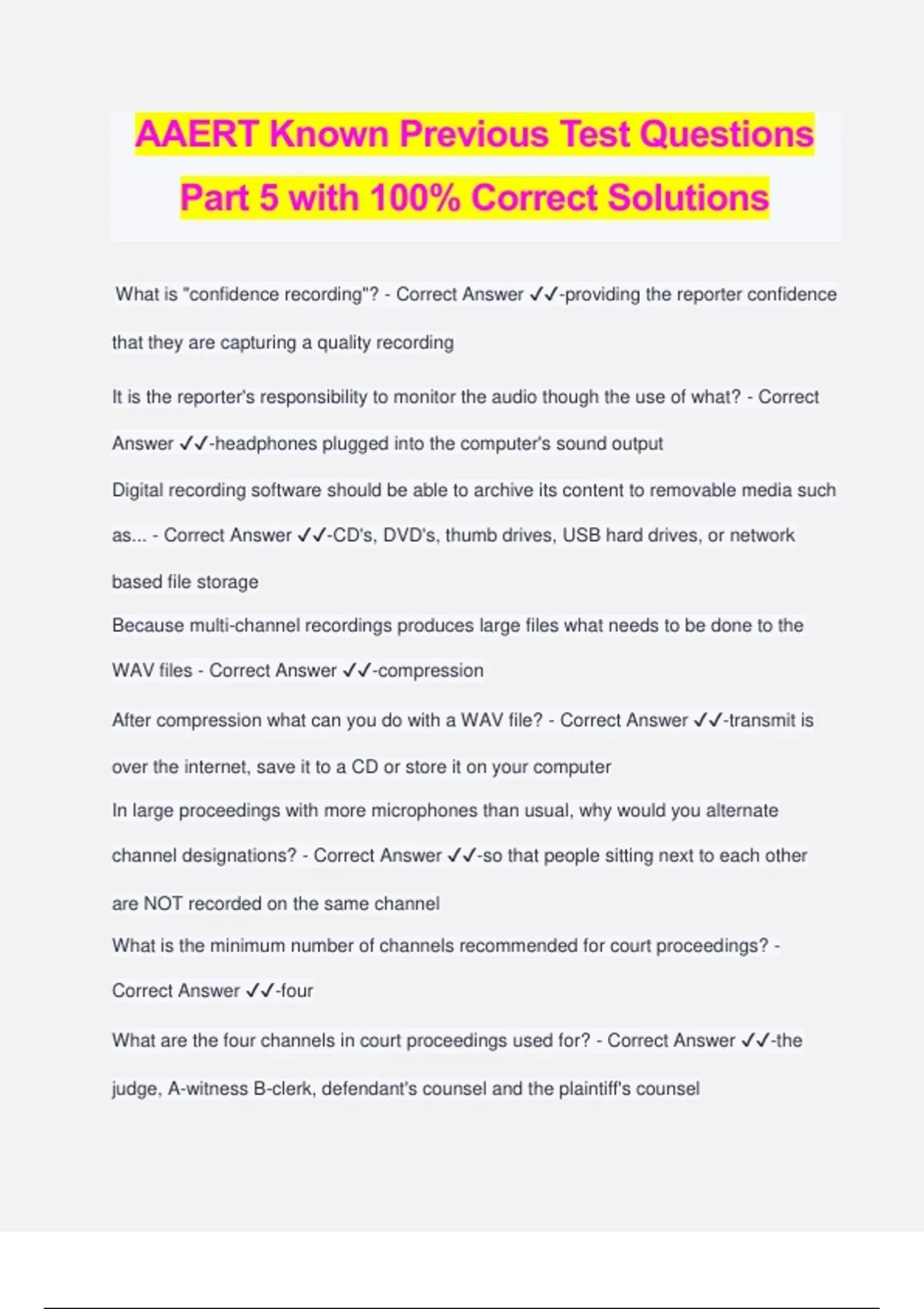 AAERT Known Previous Test Questions Part 5 with 100% Correct Solutions What is "confidence recording"? - Correct Answer ️️ -providing the reporter confidence that they are capturing a quality recording It is the reporter's responsibility to monitor the audio though the use of what? - Correct Answer ️️ -headphones plugged into the computer's sound output Digital recording software should be able to archive its content to removable media such as... - Correct Answer ️️ -CD's, DVD's, thumb drives, USB hard drives, or network based file storage Because multi-channel recordings produces large files what needs to be done to the WAV files - Correct Answer ️️ -compression After compression what can you do with a WAV file? - Correct Answer ️️ -transmit is over the internet, save it to a CD or store it on your computer In large proceedings with more microphones than usual, why would you alternate channel designations? - Correct Answer ️️ -so that people sitting next to each other are NOT recorded on the same channel What is the minimum number of channels recommended for court proceedings? - Correct Answer ️️ -four What are the four channels in court proceedings used for? - Correct Answer ️️ -the judge, A-witness B-clerk, defendant's counsel and the plaintiff's counsel