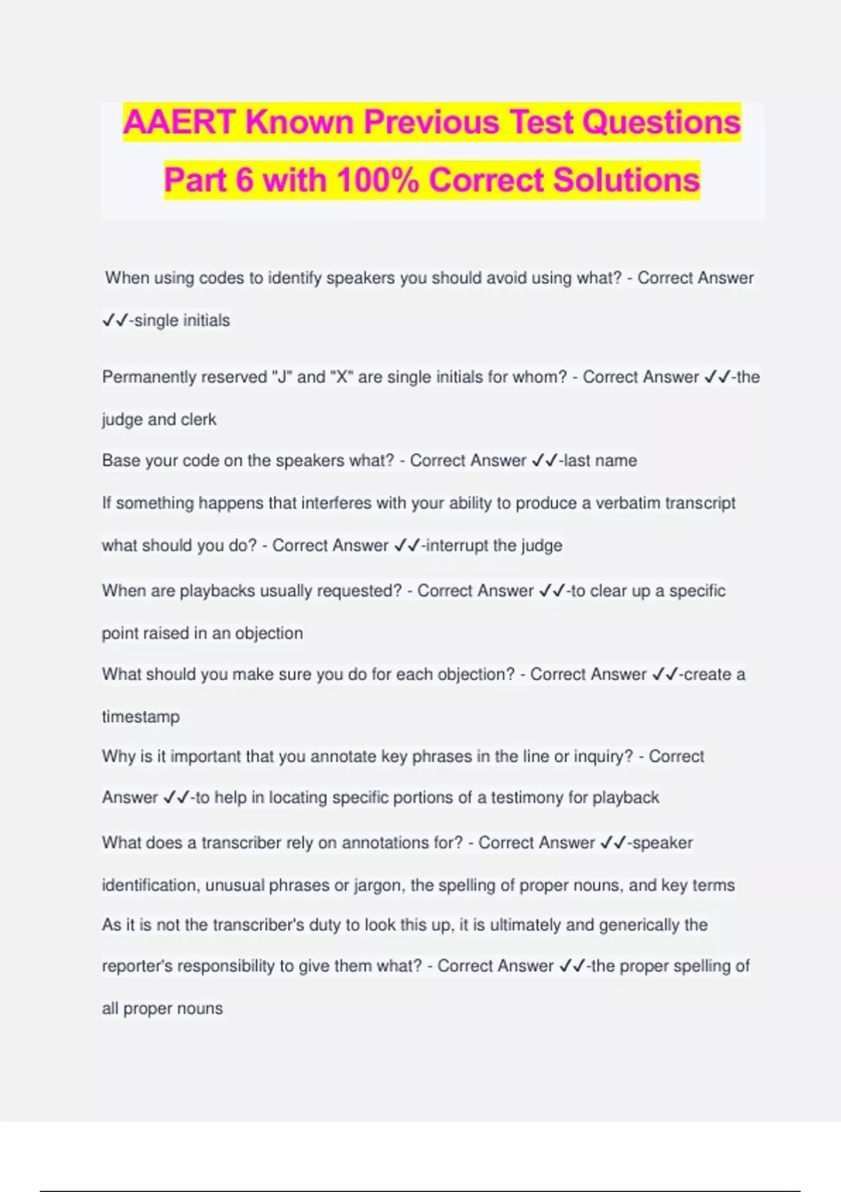 AAERT Known Previous Test Questions Part 6 with 100% Correct Solutions When using codes to identify speakers you should avoid using what? - Correct Answer ️️ -single initials Permanently reserved "J" and "X" are single initials for whom? - Correct Answer ️️ -the judge and clerk Base your code on the speakers what? - Correct Answer ️️ -last name If something happens that interferes with your ability to produce a verbatim transcript what should you do? - Correct Answer ️️ -interrupt the judge When are playbacks usually requested? - Correct Answer ️️ -to clear up a specific point raised in an objection What should you make sure you do for each objection? - Correct Answer ️️ -create a timestamp Why is it important that you annotate key phrases in the line or inquiry? - Correct Answer ️️ -to help in locating specific portions of a testimony for playback