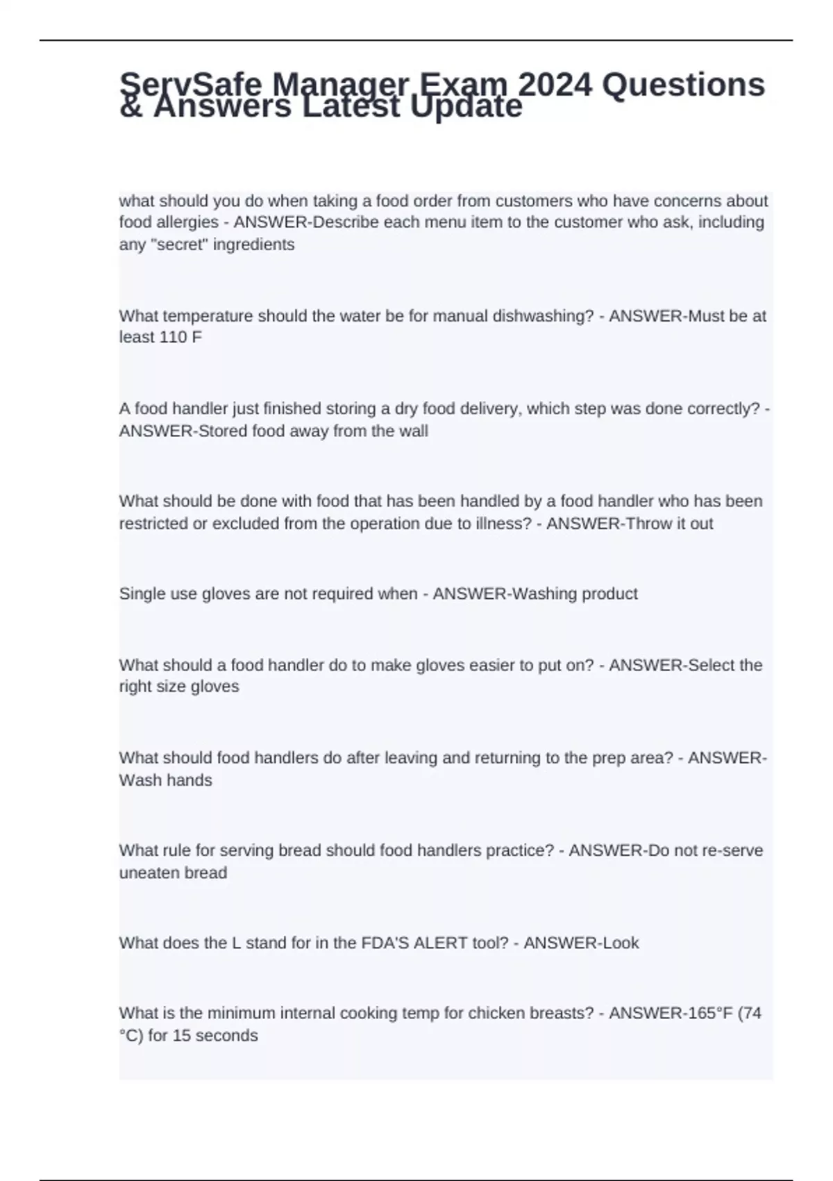 what should you do when taking a food order from customers who have concerns about food allergies - ANSWER-Describe each menu item to the customer who ask, including any "secret" ingredients What temperature should the water be for manual dishwashing? - ANSWER-Must be at least 110 F A food handler just finished storing a dry food delivery, which step was done correctly? - ANSWER-Stored food away from the wall What should be done with food that has been handled by a food handler who has been restricted or excluded from the operation due to illness? - ANSWER-Throw it out Single use gloves are not required when - ANSWER-Washing product What should a food handler do to make gloves easier to put on? - ANSWER-Select the right size gloves What should food handlers do after leaving and returning to the prep area? - ANSWER-Wash hands What rule for serving bread should food handlers practice? - ANSWER-Do not re-serve uneaten bread What does the L stand for in the FDA'S ALERT tool? - ANSWER-Look What is the minimum internal cooking tem