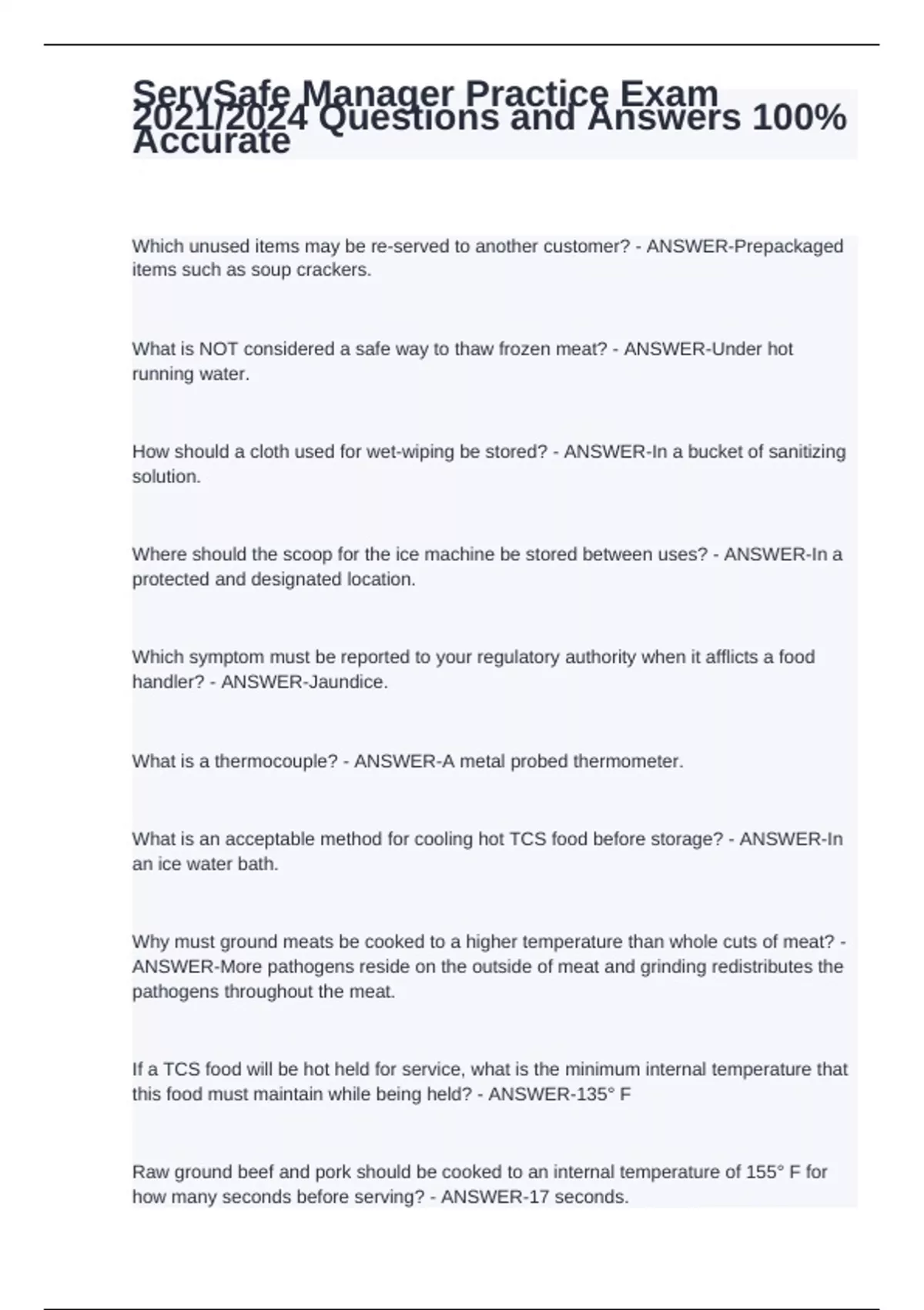 Which unused items may be re-served to another customer? - ANSWER-Prepackaged items such as soup crackers. What is NOT considered a safe way to thaw frozen meat? - ANSWER-Under hot running water. How should a cloth used for wet-wiping be stored? - ANSWER-In a bucket of sanitizing solution. Where should the scoop for the ice machine be stored between uses? - ANSWER-In a protected and designated location. Which symptom must be reported to your regulatory authority when it afflicts a food handler? - ANSWER-Jaundice. What is a thermocouple? - ANSWER-A metal probed thermometer. What is an acceptable method for cooling hot TCS food before storage? - ANSWER-In an ice water bath. Why must ground meats be cooked to a higher temperature than whole cuts of meat? - ANSWER-More pathogens reside on the outside of meat and grinding redistributes the pathogens throughout the meat. If a TCS food will be hot held for service, what is the minimum internal temperature that this food must maintain while being held? - ANSWER-135° F