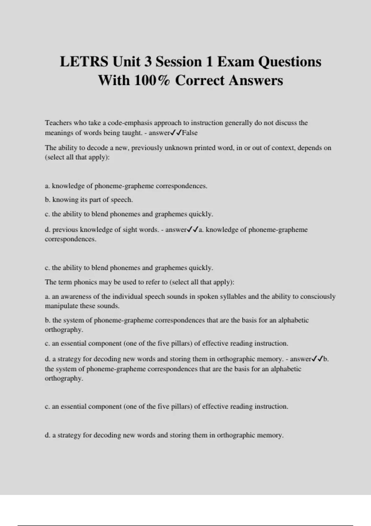 LETRS Unit 3 Session 1 Exam Questions With 100% Correct Answers Teachers who take a code-emphasis approach to instruction generally do not discuss the meanings of words being taught. - answerFalse The ability to decode a new, previously unknown printed word, in or out of context, depends on (select all that apply): a. knowledge of phoneme-grapheme correspondences. b. knowing its part of speech. c. the ability to blend phonemes and graphemes quickly. d. previous knowledge of sight words. - answera. knowledge of phoneme-grapheme correspondences. c. the ability to blend phonemes and graphemes quickly. The term phonics may be used to refer to (select all that apply): a. an awareness of the individual speech soun