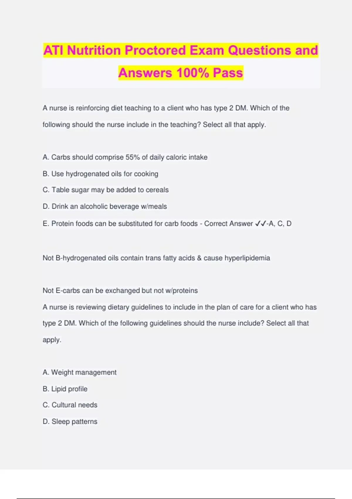 ATI Nutrition Proctored Exam Questions and Answers 100% Pass A nurse is reinforcing diet teaching to a client who has type 2 DM. Which of the following should the nurse include in the teaching? Select all that apply. A. Carbs should comprise 55% of daily caloric intake B. Use hydrogenated oils for cooking C. Table sugar may be added to cereals D. Drink an alcoholic beverage w/meals E. Protein foods can be substituted for carb foods - Correct Answer ️️ -A, C, D Not B-hydrogenated oils contain trans fatty acids & cause hyperlipidemia Not E-carbs can be exchanged but not w/proteins A nurse is reviewing dietary guidelines to include in the plan of care for a client who has type 2 DM. Which of the following guidelines should the nurse include? Select all that apply. A. Weight management B. Lipid profile C. Cultural needs D. Sleep patterns E. Personal preferences - Correct Answer ️️ -A, B, C, E To avoid hypoglycemia, the client should consume alcohol... - Correct Answer ️️ -with a meal or immediately after a meal _______________can be included in a diabetic diet as long as adequate insulin or other agents are provided to cover the sugar intake. - Correct Answer ️️ -Sucrose (table sugar) The nurse should instruct the diabetic client that their intake of carbohydrates should be ___to___% of total daily caloric intake. - Correct Answer ️️ -45-60% A nurse is teaching a client measures for healthy bones. Which of the following statements by the client requires additional teaching? A. "I will eat foods high in calcium." B. "I will increase my fluid intake." C. "I should participate in weight bearing exercises." D. "I should get my vitamin D from the sunlight." - Correct Answer ️️ -B. increasing fluid does not promote healthy bones A nurse is conducting a nutritional class to a group of newly licensed nurses. Which of the following should be included in the teaching? A. Limit saturated fat to 10% of total caloric intake. B. Good bowel function requires 35 g/day of fiber for women. C. Limit cholesterol consumption to 400 mg/day D. Normal functioning cardiac systems depends on B-complex vitamins - Correct Answer ️️ -A A nurse is discussing essential nutrients for normal functioning of the nervous system. Which of the following should be included in the teaching? Select all that apply. A. Calcium B. Thiamin C. Vitamin B6 D. Sodium E. Phosphorus - Correct Answer ️️ -A, B, C, D A school nurse is teaching a group of students how to read food labels. Which of the following should be included in the teaching? Select all that apply. A. Total carbohydrates B. Total fat C. Calories D. Magnesium E. Dietary fiber - Correct Answer ️️ -A, B, C, E Normal functioning of the nervous system depends on adequate levels of the B-complex vitamins, especially: and also adequate levels of ____and _____for regulators of nerve responses. - Correct Answer ️️ -thiamin, niacin, vitamin B6 and B12 calcium and sodium normal BMI: - Correct Answer ️️ -18.5-24.9 obesity BMI is classified as: - Correct Answer ️️ -BMI greater than or equal to 30 Basic food choices for kosher, orthodox Judaism diets: - Correct Answer ️️ --meat -no mixing meat and diary (cheeseburger) -no pork or shellfish -fish must have scales & fins to be kosher A client who follows seventh-day Adventist dietary laws will eat a strict: They also avoid: - Correct Answer ️️ -vegetarian diet, some are lacto-ovo, some are vegan. they avoid alcohol, coffee, tea and caffeinated beve