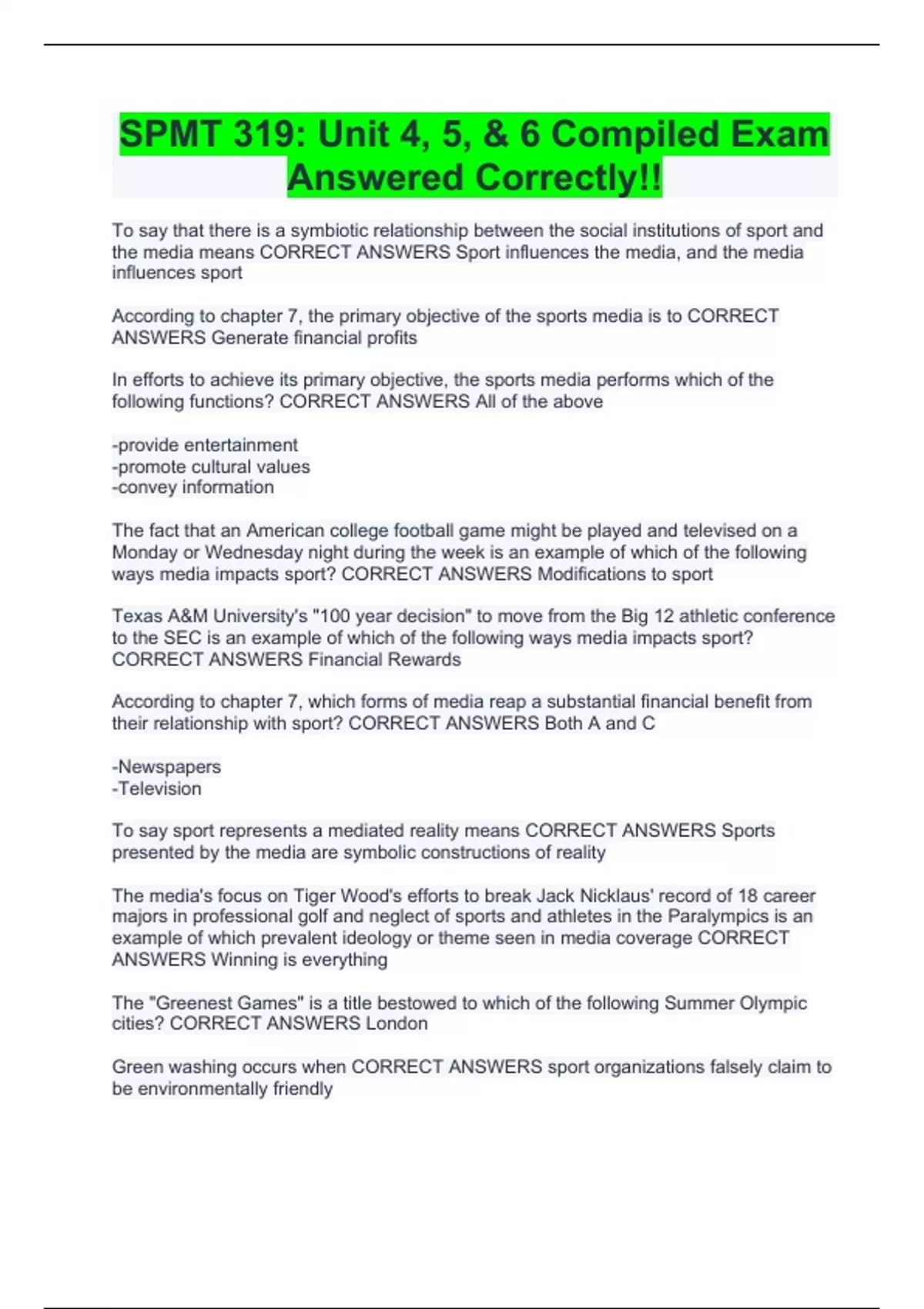 SPMT 319: Unit 4, 5, & 6 Compiled Exam Answered Correctly!!