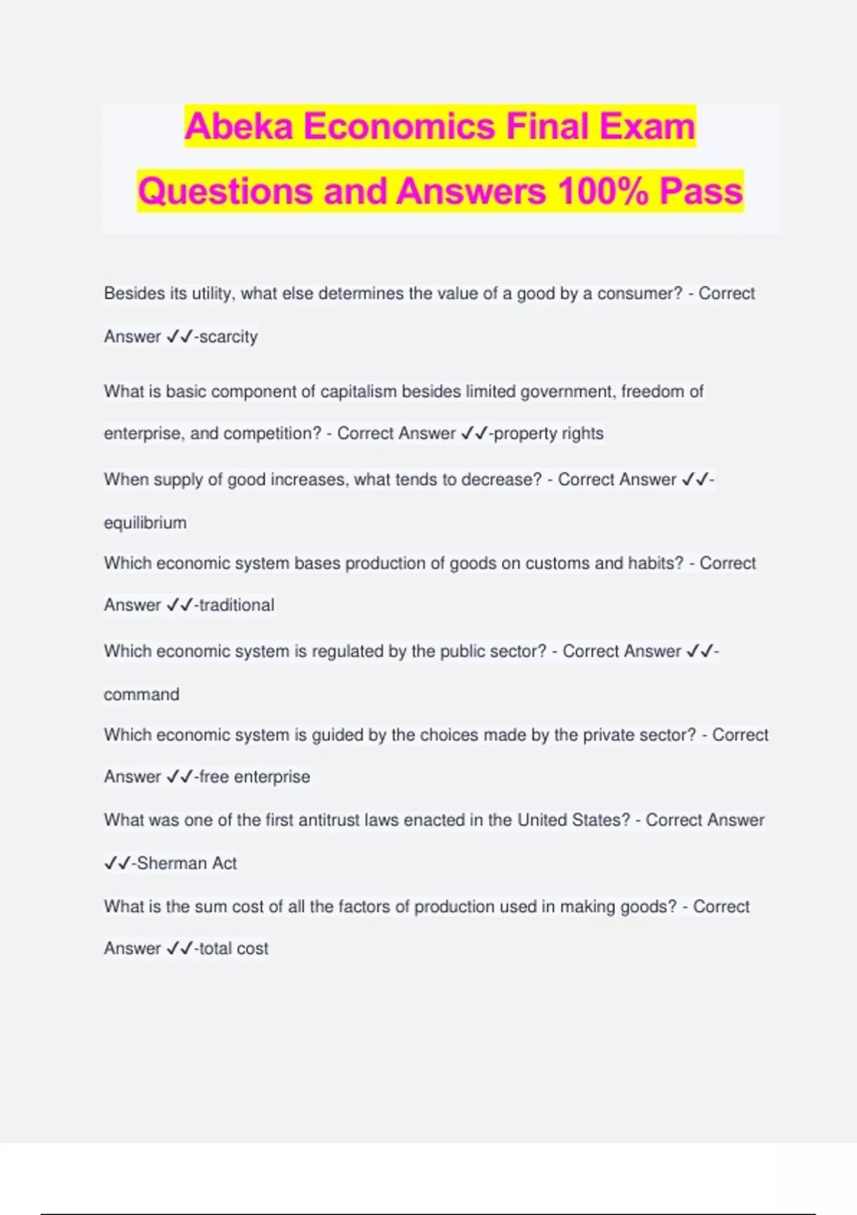 Abeka Economics Final Exam Questions and Answers 100% Pass