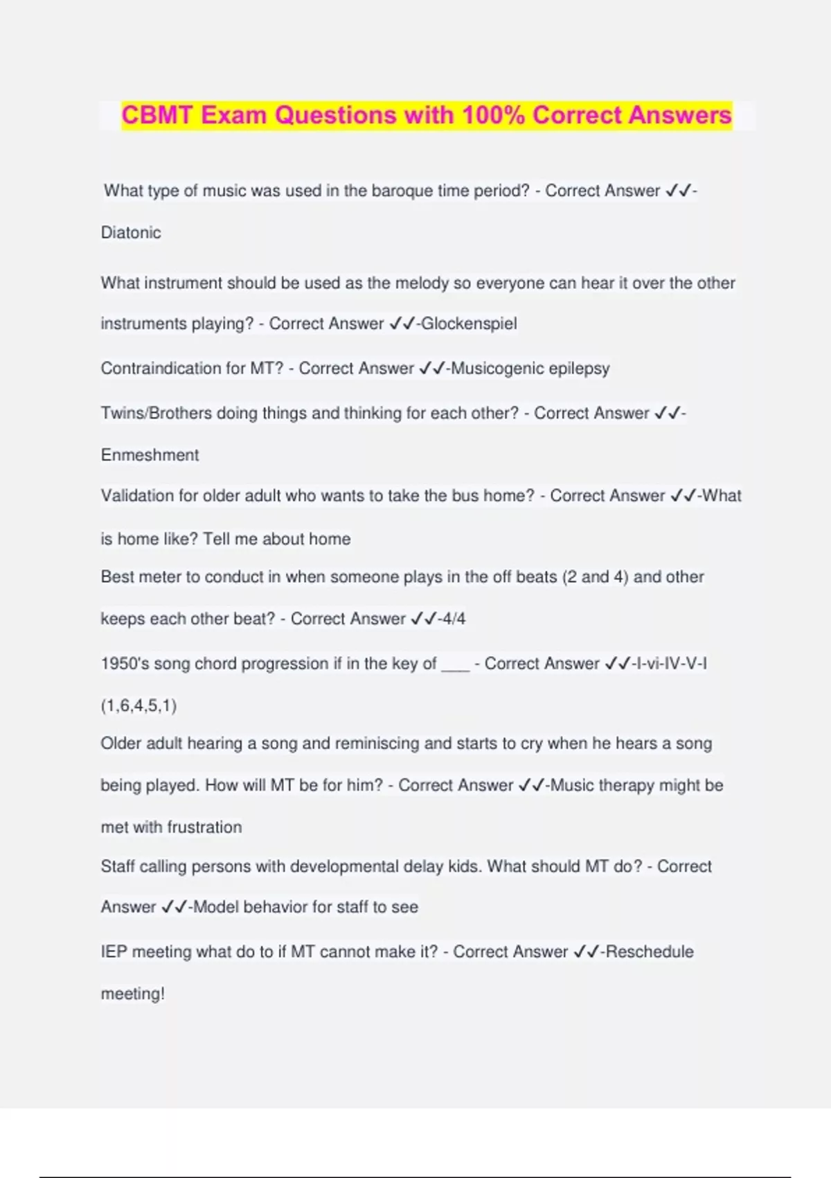 CBMT Exam Questions with 100% Correct Answers What type of music was used in the baroque time period? - Correct Answer ️️ - Diatonic What instrument should be used as the melody so everyone can hear it over the other instruments playing? - Correct Answer ️️ -Glockenspiel Contraindication for MT? - Correct Answer ️️ -Musicogenic epilepsy Twins/Brothers doing things and thinking for each other? - Correct Answer ️️ - Enmeshment Validation for older adult who wants to take the bus home? - Correct Answer ️️ -What is home like? Tell me about home Best meter to conduct in when someone plays in the off beats (2 and 4) and other keeps each other beat? - Correct Answer ️️ -4/4 1950's song chord progression if in the key of ___ - Correct Answer ️️ -I-vi-IV-V-I (1,6,4,5,1) Older adult hearing a song and reminiscing and starts to cry when he hears a song being played. How will MT be for him? - Correct Answer ️️ -Music therapy might be met with frustration Staff calling persons with developmental delay kids. What should MT do? - Correct Answer ️️ -Model behavior for staff to see IEP meeting what do to if MT cannot make it? - Correct Answer ️️ -Reschedule meeting! Starting chord for Happy Birthday - Correct Answer ️️ -Sol You have countertransference with a client. What is your first step? - Correct Answer ️️ -Do not brush feelings aside, acknowledge while meeting the immediate needs of the client. (Remember, the answer needs to be 100% corrent, not just half right.) You have to tune your guitar but don't have a tuner? You do have the pitch 440Hz. What string should you tune first? - Correct Answer ️️ -A (A440) Patient is new to MT group. They are in their manic stage of bipolar. What would their reaction be to the group who is having to say goodbye to the therapist? - Correct Answer ️️ -Manic stage symptoms: Abnormally upbeat, jumpy or wired. Very hyperactive. Euphoria. So the client would most likely... Interrupt frequently, tell everyone to cheer up and sing happy songs would Patient with a moderate cognitive disability and difficulty with expressive language: Do you do a songwriting experience with them where you substitute one word to a familiar song or substitute a small phrase to a familiar song? - Correct Answer ️️ -One word Hospice client that is not able to communicate anymore. Caregiver is giving information about songs they like: Agitated when describing. What should MT do? - Correct Answer ️️ -Slow familiar music to match breathing Different computers have all the same information: - Correct Answer ️️ -Computer interface Kid with autism playing romantic rigidly: Romantic is melodically. Baroque is strict. Why? - Correct Answer ️️ -Not matching emotions appropriately. They struggle with correct expression. Kid began playing rhythmic pattern aggressively in time: - Correct Answer ️️ - Understand autism is rigid What lines in the 12 bar blues are repeated? - Correct Answer ️️ -First and second Interval between 6th + 7th scale degree in a harmonic minor? - Correct Answer ️️ - Minor 3rd Tempos 70 BPM 210 BPM: Best way bring together? What time signature? - Correct Answer ️️ -In 3 Song conducting group ¾ but speed was 180 bpm: Best way to conduct? - Correct Answer ️️ -In 1 Bb instrument needs to play C major scale, what note do