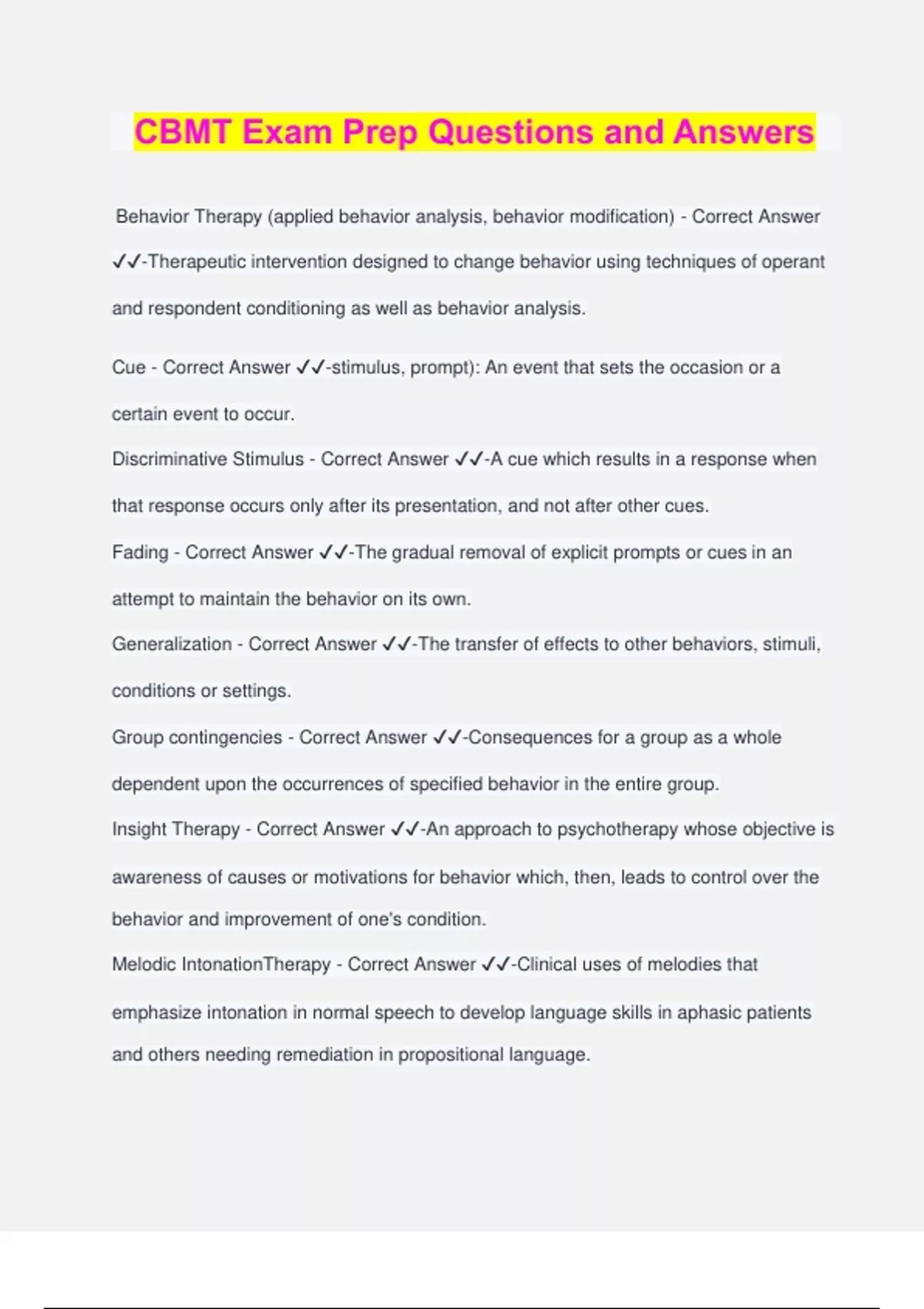 CBMT Exam Prep Questions and Answers Behavior Therapy (applied behavior analysis, behavior modification) - Correct Answer ️️ -Therapeutic intervention designed to change behavior using techniques of operant and respondent conditioning as well as behavior analysis. Cue - Correct Answer ️️ -stimulus, prompt): An event that sets the occasion or a certain event to occur. Discriminative Stimulus - Correct Answer ️️ -A cue which results in a response when that response occurs only after its presentation, and not after other cues. Fading - Correct Answer ️️ -The gradual removal of explicit prompts or cues in an attempt to maintain the behavior on its own. Generalization - Correct Answer ️️ -The transfer of effects to other behaviors, stimuli, conditions or settings. Group contingencies - Correct Answer ️️ -Consequences for a group as a whole dependent upon the occurrences of specified behavior in the entire group. Insight Therapy - Correct Answer ️️ -An approach to psychotherapy whose objective is awareness of causes or motivations for behavior which, then, leads to control over the behavior and improvement of one's condition. Melodic IntonationTherapy - Correct Answer ️️ -Clinical uses of melodies that emphasize intonation in normal speech to develop language skills in aphasic patients and others needing remediation in propositional language