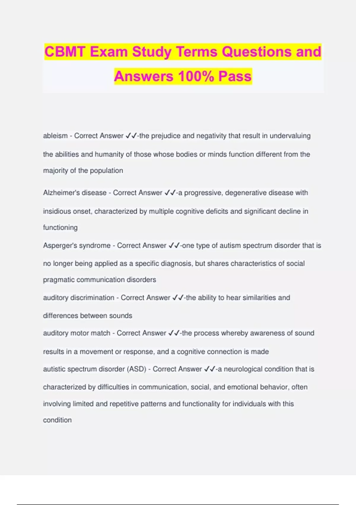 CBMT Exam Study Terms Questions and Answers 100% Pass ableism - Correct Answer ️️ -the prejudice and negativity that result in undervaluing the abilities and humanity of those whose bodies or minds function different from the majority of the population Alzheimer's disease - Correct Answer ️️ -a progressive, degenerative disease with insidious onset, characterized by multiple cognitive deficits and significant decline in functioning Asperger's syndrome - Correct Answer ️️ -one type of autism spectrum disorder that is no longer being applied as a specific diagnosis, but shares characteristics of social pragmatic communication disorders auditory discrimination - Correct Answer ️️ -the ability to hear similarities and differences between sounds auditory motor match - Correct Answer ️️ -the process whereby awareness of sound results in a movement or response, and a cognitive connection is made autistic spectrum disorder (ASD) - Correct Answer ️️ -a neurological condition that is characterized by difficulties in communication, social, and emotional behavior, often involving limited and repetitive patterns and functionality for individuals with this condition autonomic nervous system (ANS) - Correct Answer ️️ -the web of nerves and ganglia, divided into parasympathetic and sympathetic nervous systems, that control and regulate involuntary behavior behavioral disorder - Correct Answer ️️ -a problem in social behavior that is sufficiently extreme as to interfere with the learning process (often emotional disorder is considered) Bonny Method of Guided Imagery and Music (BM-GIM) - Correct Answer ️️ -a method of transformational therapy that uses selected pieces of classical music as catalysts for visual imagery that is shared by the listener with a trained facilitator child life specialists - Correct Answer ️️ -professionals working primarily in medical settings for the benefit of children and families, by providing play and diversional activities, as well as preparation for medical procedures, to help them deal with the stress of hospitalization and to enhance their well-being communication disorder - Correct Answer ️️ -a disability which is characterized by the difficulty in or inability to process, send, transfer, or comprehend thought cultural humility - Correct Answer ️️ -an approach to multiculturalism applied to healthcare and other fields, with an orientation to others that emphasizes their cultural identities, as defined by those persons dementia - Correct Answer ️️ -a set of symptoms characterized by deterioration in cognitive functioning, particularly memory, abstract thinking, judgment, and problem solving developmental disability - Correct Answer ️️ -a severe, chronic, mental, or physical impairment (or set of impairments) originating in childhood, resulting in significant functional limitations in behavior, learning, language, and/or physical development entrainment - Correct Answer ️️ -synchronization of behavior, mood, or physiological response to an external rhythm evidence-based practice - Correct Answer ️️ -the use of the most up-to-date and valid research for making clinical decisions existential therapy - Correct Answer ️️ -a system of psychotherapy emphasizing the search for meaning and constructing meaning from difficult or challenging life experiences fine motor dexterity (coordination) - Correct Answer ️️ -the use of small muscles for reaching, grasping, and manipulating objec