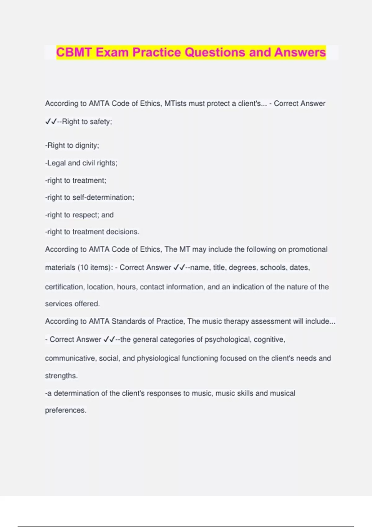 CBMT Exam Practice Questions and Answers According to AMTA Code of Ethics, MTists must protect a client's... - Correct Answer ️️ --Right to safety; -Right to dignity; -Legal and civil rights; -right to treatment; -right to self-determination; -right to respect; and -right to treatment decisions. According to AMTA Code of Ethics, The MT may include the following on promotional materials (10 items): - Correct Answer ️️ --name, title, degrees, schools, dates, certification, location, hours, contact information, and an indication of the nature of the services offered. According to AMTA Standards of Practice, The music therapy assessment will include... - Correct Answer ️️ --the general categories of psychological, cognitive, communicative, social, and physiological functioning focused on the client's needs and strengths. -a determination of the client's responses to music, music skills and musical preferences. HIPAA (Health Insurance Portability and Accountability Act) - Correct Answer ️️ - Enacted by the United States Congress on August 21, 1996 under Public Law 104-191. Title I protects health insurance coverage for workers and their families when they change or lose their jobs. Title II, known as the Administrative Simplification (AS) provisions, requires the establishment of national standards for electronic health care transactions and national identifiers for providers, health insurance plans, and employers. Individually identifiable health information (IHI), (HIPAA) includes demographic data, that relates to: - Correct Answer ️️ -• the individual's past, present or future physical or mental health or condition, • the provision of health care to the individual, or • the past, present, or future payment for the provision of health care to the individual, and that identifies the individual or for which there is a reasonable basis to believe can be used to identify the individual. (e.g., name, address, birth date, Social Security Number) When planning treatment, evidence-based practice (EBP) principles require music therapists to take into account... - Correct Answer ️️ -. ...best available research; patient characteristics, culture and preferences; and clinical expertise Cerebral Palsy - Correct Answer ️️ -Nonprogressive physical disorder of movement and posture caused by damage to motor areas of the brain. Can be congenital or acquired. It is most often classified accoriding to specific motor abnormality, including: -Spastic -Athetosis -Ataxia -Tremor -Mixed -Atonia Spina Bifida - Correct Answer ️️ -Defect in the spinal column caused during fetal development, by a failure of the back arches of the vertebra to close before birth. Many children experience -paralysis of trunk and pelvis, -bony deformities, -loss of skin sensation, -paralysis of bladder and/or bowel, -hydrocephalus (which is also associated with mental retardation). Juvenile Rheumatoid Arthritis - Correct Answer ️️ -Although the exact cause of this condition is unclear, the inflammation of joints is thought to be caused by abnormal antibodies attacking normal body tissue. Most child sufferers will be free from active disease within 10 years after onset. Dwarfism - Correct Answer ️️ -A congenital condition that is due to abnormal skeletal development and is characterized by a retardation of physical growth. Most dwarfs have relatively normal heads and trunks, with disproportionately short arms and legs. Physical mobility is rarely restricted, and intelligence is normal to above average. Osteogenesis Imperfecta (OI) - Correct Answer ️️ -An inherited condition, also known as brittle bones disease. Presents with weak bones, short limbs that deform easily due to repetitive fractures and deformed healing. Joints are excessively mobile due to greater elasticity of muscle tissue and skin. Intelligence is unaffected. Poliomyelitis - Correct Answer ️️ -A viral infection that attacks the motor cells in the spinal chord. Damage may be temporary or permanent, and may result in moderate to severe paralysis of lower limbs and/or trunk, and scoliosis. Assumptions, said to be foundational to the AMTA Scope of Practice: - Correct Answer ️️ --Public Protection: Practice competently, safely, and ethically. -Requisite Training and Skill Sets: Scope of practice/ level of competence. -Evidence-Based Practice: Best available research evidence, client's needs, values, and preferences, and expertise of the clinician. -Overlap in Services: Other professionals may use music, as appropriate, within their scope. -Professional Collaboration: (music therapists and non-music therapists) -Client-Centered Care: Respectful of, and responsive to the needs, values, and preferences of client and family. To protect the public from threats of harm in clinical practice, music therapists comply with safety standards and competencies such as, but not limited to: - Corre