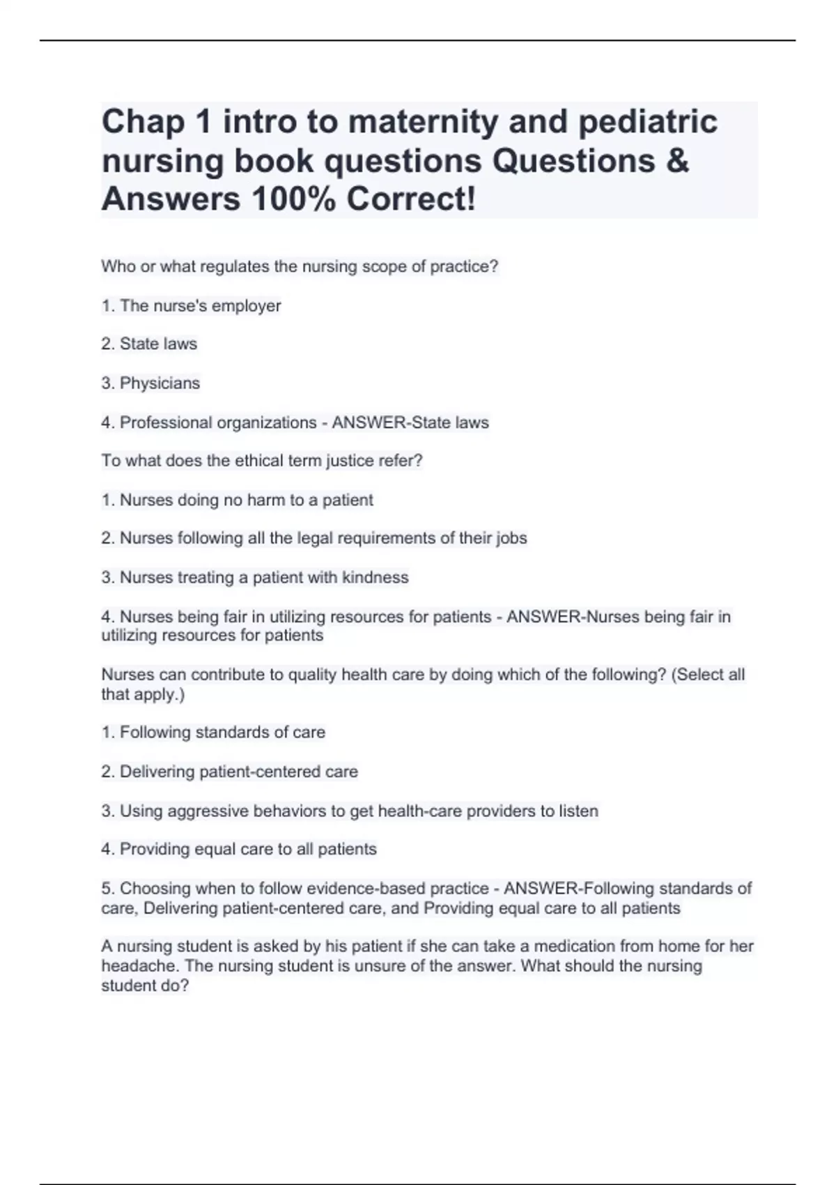 Who or what regulates the nursing scope of practice? 1. The nurse's employer 2. State laws 3. Physicians 4. Professional organizations - ANSWER-State laws To what does the ethical term justice refer? 1. Nurses doing no harm to a patient 2. Nurses following all the legal requirements of their jobs 3. Nurses treating a patient with kindness 4. Nurses being fair in utilizing resources for patients - ANSWER-Nurses being fair in utilizing resources for patients Nurses can contribute to quality health care by doing which of the following? (Select all that apply.) 1. Following standards of care 2. Delivering patient-centered care 3. Using aggressive behaviors to get health-care providers to listen 4. Providing equal care to all patients 5. Choosing when to follow evidence-based practice - ANSWER-Following standards of care, Delivering patient-centered care, and Providing equal care to all patients A nursing student is asked by his patient if she can take a medication from home for her headache. The nursing student is unsure of the answer. What should the nursing student do? 1. Tell the patient it is alright to take the medication. 2. Tell the patient to wait and he will find out. 3. Admit that he does not know. 4. Act like he did not hear the patient. - ANSWER-Tell the patient to wait and he will find out. While preparing medications for a 3-year-old patient in the pediatric unit, the nurse notes that a very large amount of a medication has been ordered. What should the nurse's first step be?