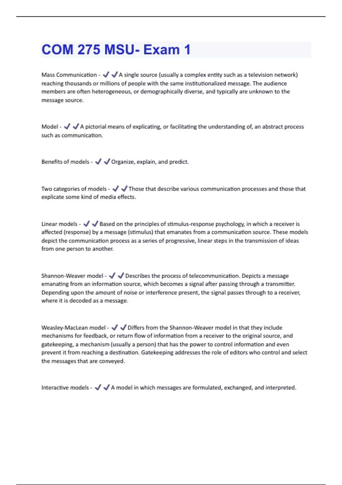 Mass Communication - A single source (usually a complex entity such as a television network) reaching thousands or millions of people with the same institutionalized message. The audience members are often heterogeneous, or demographically diverse, and typically are unknown to the message source. Model - A pictorial means of explicating, or facilitating the understanding of, an abstract process such as communication. Benefits of models - Organize, explain, and predict. Two categories of models - Those that describe various communication processes and those that explicate some kind of media effects. Linear models - Based on the principles of stimulus-response psychology, in which a receiver is affected (response) by a message (stimulus) that emanates from a communication source. These models depict the communication process as a series of progressive, linear steps in the transmission of ideas from one person to another. Shannon-Weaver model - Describes the process of telecommunication. Depicts a message emanating from an information source, which becomes a signal after passing through a transmitter. Depending upon the amount of noise or interference present, the signal passes through to a receiver, where it is decoded as a message. Weasley-MacLean model - Differs from the Shannon-Weaver model in that they include mechanisms for feedback, or return flow of information from a receiver to the original source, and gatekeeping, a mechanism (usually a person) that has the power to control information and even prevent it from reaching a destination. Gatekeeping addresses the role of editors who control and select the messages that are conveyed. Interactive models - A model in which messages are formulated, exchanged, and interpreted.Schramm interactive model - Emphasizes the sharing of information between communicators, who give and receive information interactively. Developed by communication theorist Wilbur __________ (1954), the circular model describes communication as interactive and interpretive, with communicators almost simultaneously sending and receiving messages. Switch between the role of the encoder and decoder. Transactional models - The giving and receiving of something—in this case, information—in order to create meaning. OTA transactional model - A model that separates communication into three distinct processes— message formulation, message interpretation, and message exchange—and emphasizes the interdependencies of the processes.