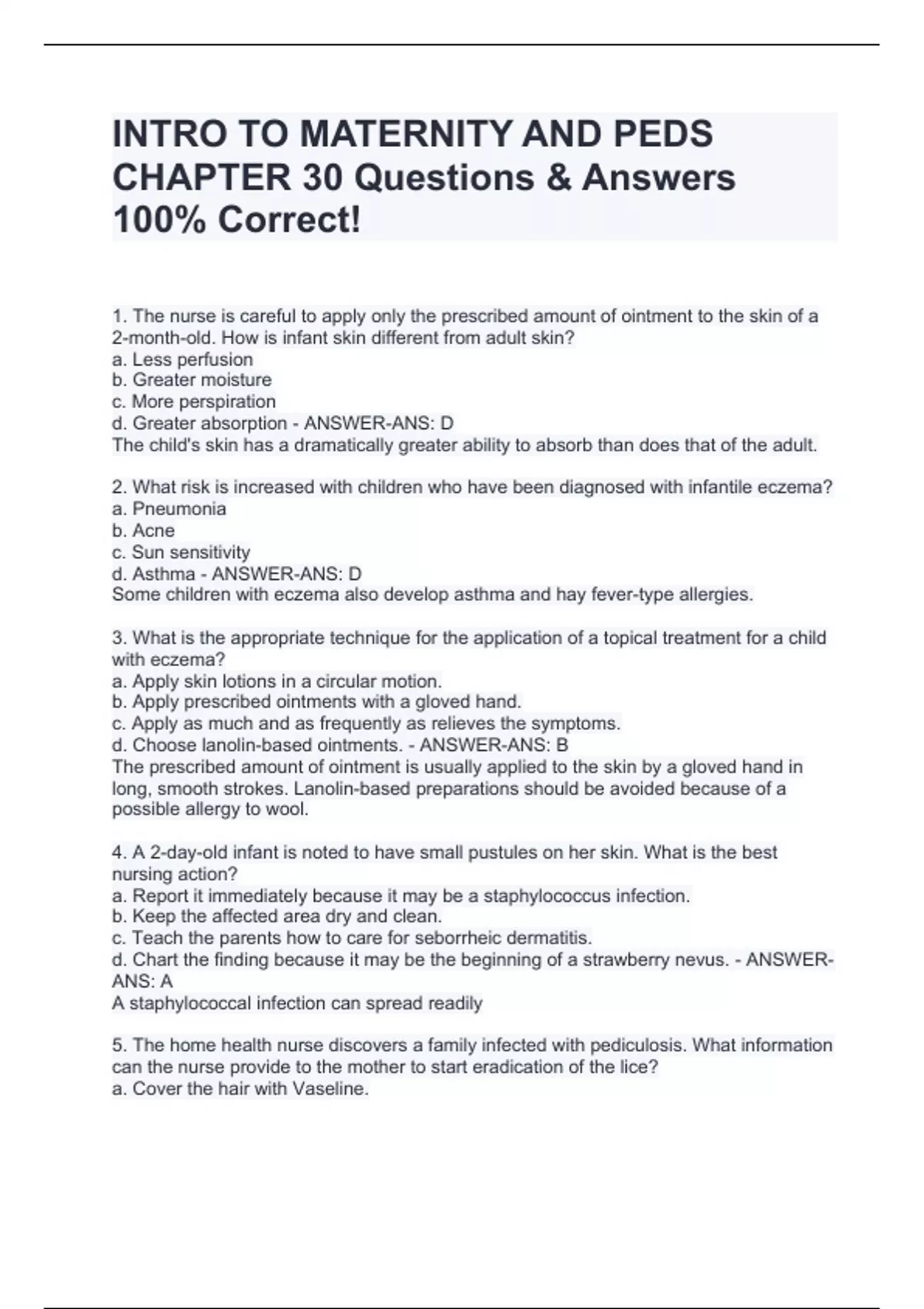 1. The nurse is careful to apply only the prescribed amount of ointment to the skin of a 2-month-old. How is infant skin different from adult skin? a. Less perfusion b. Greater moisture c. More perspiration d. Greater absorption - ANSWER-ANS: D The child's skin has a dramatically greater ability to absorb than does that of the adult. 2. What risk is increased with children who have been diagnosed with infantile eczema? a. Pneumonia b. Acne c. Sun sensitivity d. Asthma - ANSWER-ANS: D Some children with eczema also develop asthma and hay fever-type allergies. 3. What is the appropriate technique for the application of a topical treatment for a child with eczema? a. Apply skin lotions in a circular motion. b. Apply prescribed ointments with a gloved hand. c. Apply as much and as frequently as relieves the symptoms. d. Choose lanolin-based ointments. - ANSWER-ANS: B The prescribed amount of ointment is usually applied to the skin by a gloved hand in long, smooth strokes. Lanolin-based preparations should be avoided because of a possible allergy to wool. 4. A 2-day-old infant is noted to have small pustules on her skin. What is the best nursing action? a. Report it immediately because it may be a staphylococcus infection. b. Keep the affected area dry and clean. c. Teach the parents how to care for seborrheic dermatitis. d. Chart the finding because it may be the beginning of a strawberry nevus. - ANSWER-ANS: A A staphylococcal infection can spread readily 5. The home health nurse discovers a family infected with pediculosis. What information can the nurse provide to the mother to start eradication of the lice? a. Cover the hair with Vaseline. b. Apply a soda-vinegar solution to the hair. c. Comb through the hair with a vinegar-water solution. d. Shampoo the hair with dish detergent. - ANSWER-ANS: C Combing a vinegar and water solution through the hair with a fine-tooth comb and then shampooing is an initial step toward eradication. 6. A group of football players is taking oral griseofulvin for tinea pedis. What should the school nurse caution them to avoid? a. Citrus fruit and juice b. Eating shellfish c. Alcohol consumption d. Taking corticosteroids - ANSWER-ANS: C Consumption of alcohol while taking griseofulvin will cause severe tachycardia. 7. What should the nurse suggest before a 17-year-old girl starts a protocol of isotretinoin (Accutane) for her acne? a. Get a prescription for oral contraceptives. b. Increase the dose of the present medication. c. Limit intake of chocolate, cola, and peanuts. d. Increase exposure to sunlight. - ANSWER-ANS: A Oral contraceptives are often prescribed for adolescents with acne. Accutane can cause birth defects, so pregnancy should be prevented. 8. A child had a burn, evidenced by pink skin and blistering. The child complains of pain and is crying. How does the nurse classify this burn when documenting? a. First-degree b. Second-degree superficial c. Second-degree deep dermal d. Third-degree - ANSWER-ANS: B A second-degree superficial burn appears blistered, moist, and pink or red. The pain