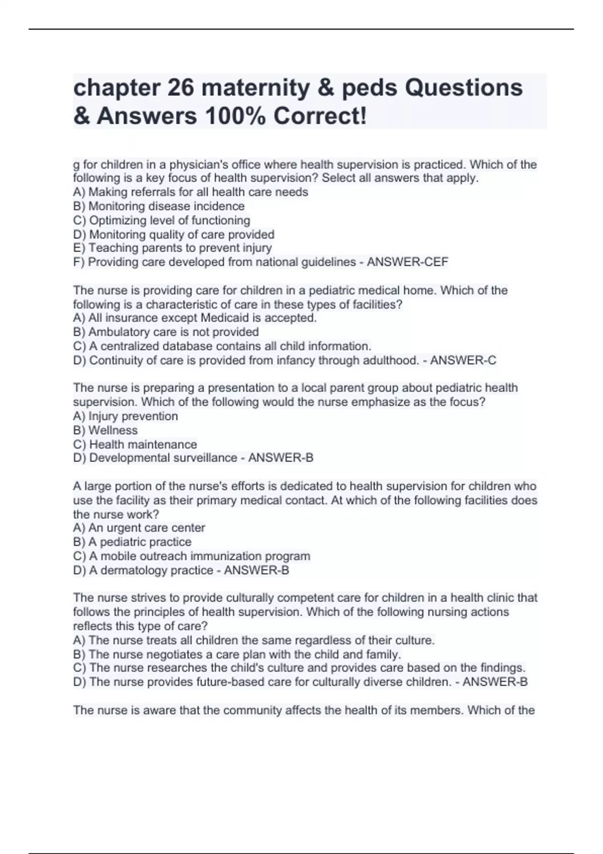 g for children in a physician's office where health supervision is practiced. Which of the following is a key focus of health supervision? Select all answers that apply. A) Making referrals for all health care needs B) Monitoring disease incidence C) Optimizing level of functioning D) Monitoring quality of care provided E) Teaching parents to prevent injury F) Providing care developed from national guidelines - ANSWER-CEF The nurse is providing care for children in a pediatric medical home. Which of the following is a characteristic of care in these types of facilities? A) All insurance except Medicaid is accepted. B) Ambulatory care is not provided C) A centralized database contains all child information. D) Continuity of care is provided from infancy through adulthood. - ANSWER-C The nurse is preparing a presentation to a local parent group about pediatric health supervision. Which of the following would the nurse emphasize as the focus? A) Injury prevention B) Wellness C) Health maintenance D) Developmental surveillance - ANSWER-B A large portion of the nurse's efforts is dedicated to health supervision for children who use the facility as their primary medical contact. At which of the following facilities does the nurse work? A) An urgent care center B) A pediatric practice C) A mobile outreach immunization program D) A dermatology practice - ANSWER-B The nurse strives to provide culturally competent care for children in a health clinic that follows the principles of health supervision. Which of the following nursing actions reflects this type of care? A) The nurse treats all children the same regardless of their culture. B) The nurse negotiates a care plan with the child and family. C) The nurse researches the child's culture and provides care based on the findings. D) The nurse provides future-based care for culturally diverse children. - ANSWER-B The nurse is aware that the community affects the health of its members. Which of the Test Bank - Maternity and Pediatric Nursing (3rd Edition) by Ricci, Kyle, and Carman 177 following statements accurately reflect a community influence of health care? Select all answers that apply. A)