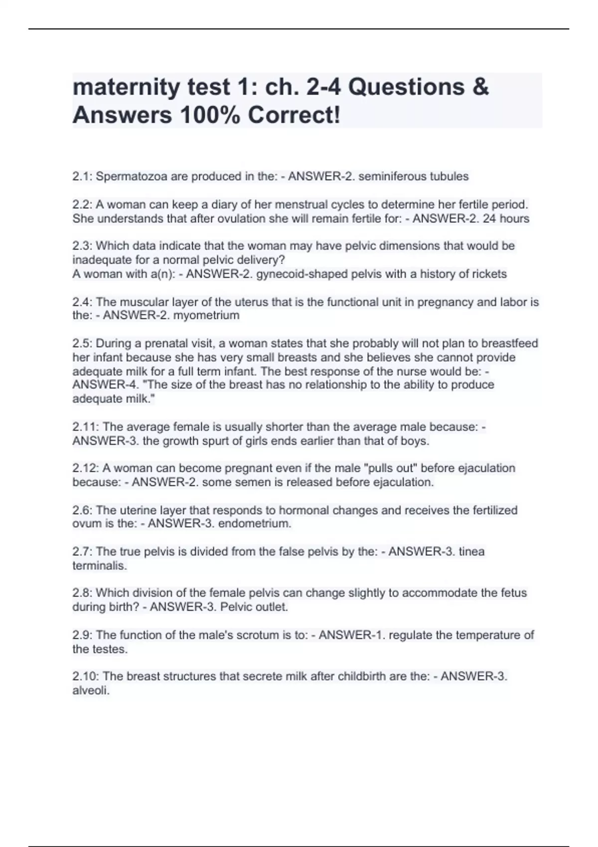 2.1: Spermatozoa are produced in the: - ANSWER-2. seminiferous tubules 2.2: A woman can keep a diary of her menstrual cycles to determine her fertile period. She understands that after ovulation she will remain fertile for: - ANSWER-2. 24 hours 2.3: Which data indicate that the woman may have pelvic dimensions that would be inadequate for a normal pelvic delivery? A woman with a(n): - ANSWER-2. gynecoid-shaped pelvis with a history of rickets 2.4: The muscular layer of the uterus that is the functional unit in pregnancy and labor is the: - ANSWER-2. myometrium 2.5: During a prenatal visit, a woman states that she probably will not plan to breastfeed her infant because she has very small breasts and she believes she cannot provide adequate milk for a full term infant. The best response of the nurse would be: - ANSWER-4. "The size of the breast has no relationship to the ability to produce adequate milk." 2.11: The average female is usually shorter than the average male because: - ANSWER-3. the growth spurt of girls ends earlier than that of boys. 2.12: A woman can become pregnant even if the male "pulls out" before ejaculation because: - ANSWER-2. some semen is released before ejaculation. 2.6: The uterine layer that responds to hormonal changes and receives the fertilized ovum is the: - ANSWER-3. endometrium. 2.7: The true pelvis is divided from the false pelvis by the: - ANSWER-3. tinea terminalis. 2.8: Which division of the female pelvis can change slightly to accommodate the fetus during birth? - ANSWER-3. Pelvic outlet. 2.9: The function of the male's scrotum is to: - ANSWER-1. regulate the temperature of the testes. 2.10: The breast structures that secrete milk after childbirth are the: - ANSWER-3. alveoli.