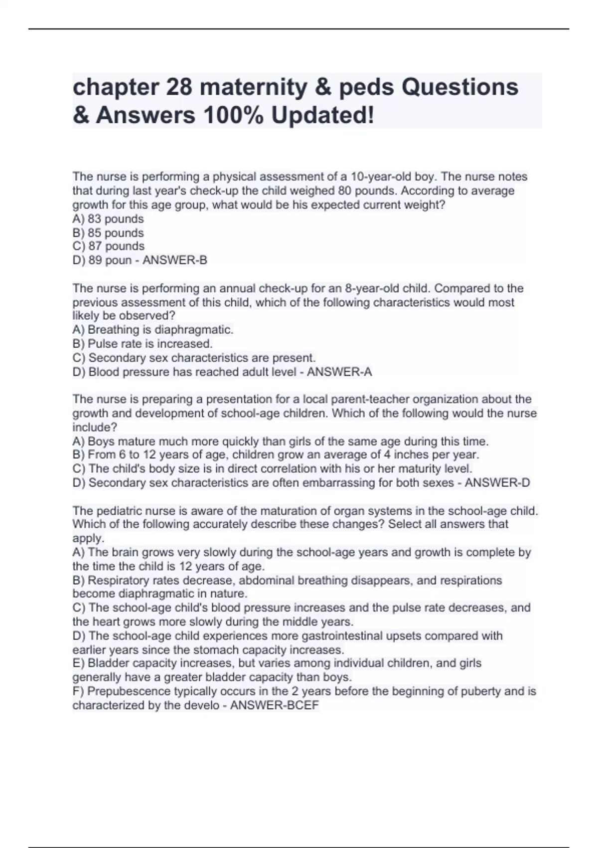 The nurse is performing a physical assessment of a 10-year-old boy. The nurse notes that during last year's check-up the child weighed 80 pounds. According to average growth for this age group, what would be his expected current weight? A) 83 pounds B) 85 pounds C) 87 pounds D) 89 poun - ANSWER-B The nurse is performing an annual check-up for an 8-year-old child. Compared to the previous assessment of this child, which of the following characteristics would most likely be observed? A) Breathing is diaphragmatic. B) Pulse rate is increased. C) Secondary sex characteristics are present. D) Blood pressure has reached adult level - ANSWER-A The nurse is preparing a presentation for a local parent-teacher organization about the growth and development of school-age children. Which of the following would the nurse include? A) Boys mature much more quickly than girls of the same age during this time. B) From 6 to 12 years of age, children grow an average of 4 inches per year. C) The child's body size is in direct correlation with his or her maturity level. D) Secondary sex characteristics are often embarrassing for both sexes - ANSWER-D The pediatric nurse is aware of the maturation of organ systems in the school-age child. Which of the following accurately describe these changes? Select all answers that apply. A) The brain grows very slowly during the school-age years and growth is complete by the time the child is 12 years of age. B) Respiratory rates decrease, abdominal breathing disappears, and respirations become diaphragmatic in nature. C) The school-age child's blood pressure increases and the pulse rate decreases, and the heart grows more slowly during the middle years. D) The school-age child experiences more gastrointestinal upsets compared with earlier years since the stomach capacity increases. E) Bladder capacity increases, but varies among individual children, and girls generally have a greater bladder capacity than boys. F) Prepubescence typically occurs in the 2 years before the beginning of puberty and is characterized by the develo - ANSWER-BCEF The nurse is using the formula for bladder capacity to measure the bladder capacity of a 9-year-old girl. What number would the nurse document for this measurement? A) 9 ounc B) 10 ounces C) 11 ounces