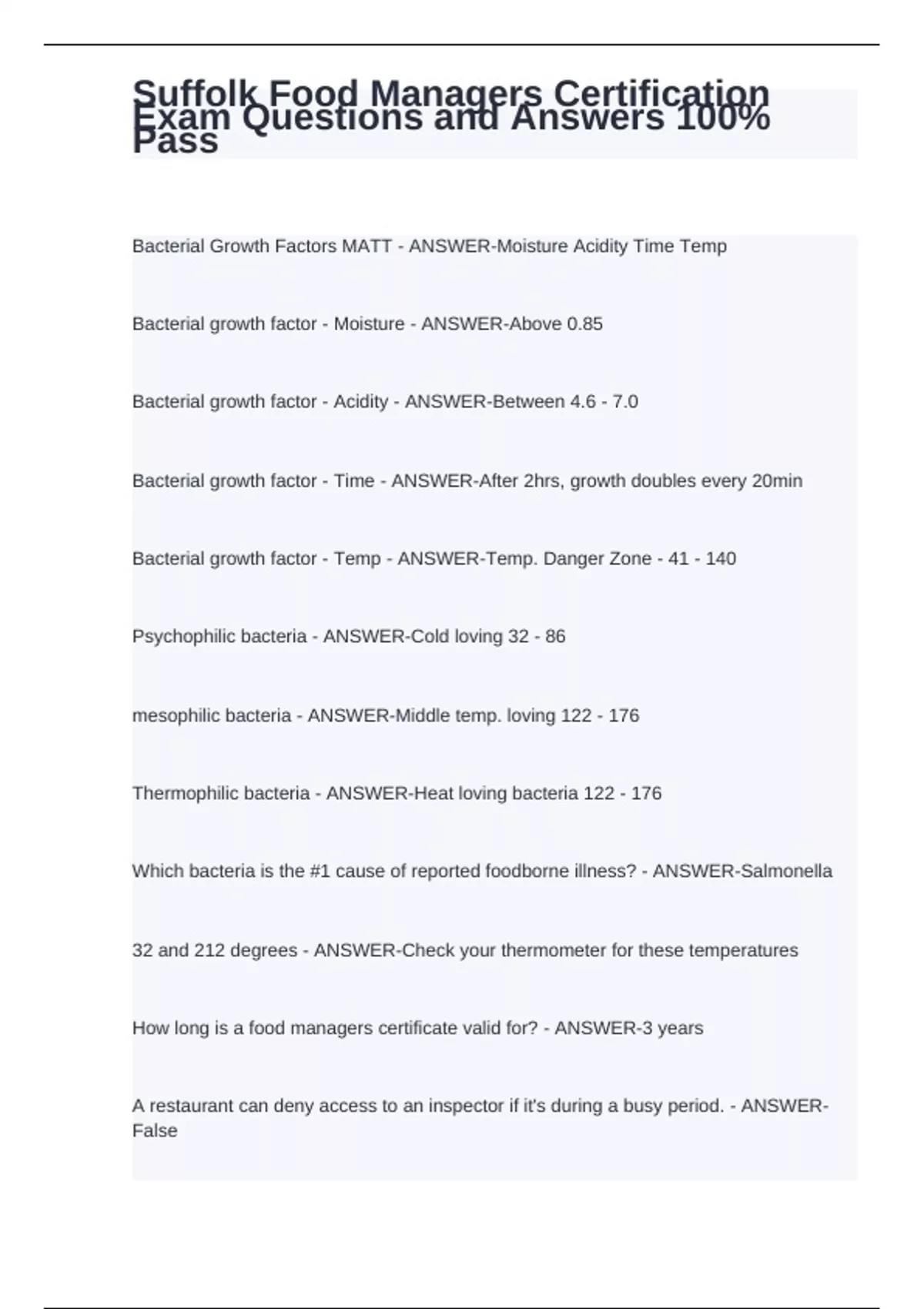 Bacterial Growth Factors MATT - ANSWER-Moisture Acidity Time Temp Bacterial growth factor - Moisture - ANSWER-Above 0.85 Bacterial growth factor - Acidity - ANSWER-Between 4.6 - 7.0 Bacterial growth factor - Time - ANSWER-After 2hrs, growth doubles every 20min Bacterial growth factor - Temp - ANSWER-Temp. Danger Zone - 41 - 140 Psychophilic bacteria - ANSWER-Cold loving 32 - 86 mesophilic bacteria - ANSWER-Middle temp. loving 122 - 176 Thermophilic bacteria - ANSWER-Heat loving bacteria 122 - 176 Which bacteria is the #1 cause of reported foodborne illness? - ANSWER-Salmonella 32 and 212 degrees - ANSWER-Check your thermometer for these temperatures How long is a food managers certificate valid for? - ANSWER-3 years