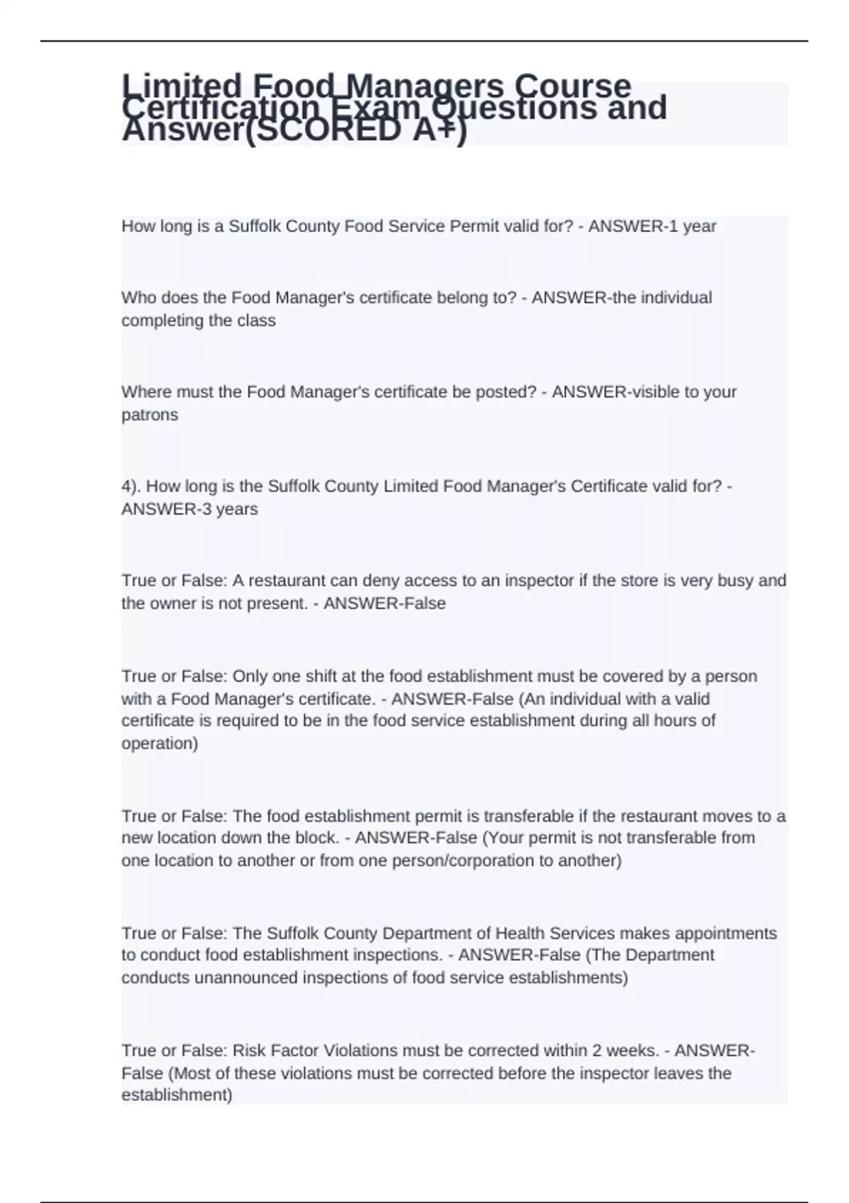 How long is a Suffolk County Food Service Permit valid for? - ANSWER-1 year Who does the Food Manager's certificate belong to? - ANSWER-the individual completing the class Where must the Food Manager's certificate be posted? - ANSWER-visible to your patrons 4). How long is the Suffolk County Limited Food Manager's Certificate valid for? - ANSWER-3 years True or False: A restaurant can deny access to an inspector if the store is very busy and the owner is not present. - ANSWER-False True or False: Only one shift at the food establishment must be covered by a person with a Food Manager's certificate. - ANSWER-False (An individual with a valid certificate is required to be in the food service establishment during all hours of operation) True or False: The food establishment permit is transferable if the restaurant moves to a new location down the block. - ANSWER-False (Your permit is not transferable from one location to another or from one person/corporation to another) True or False: The Suffolk County Department of Health Services makes appointments to conduct food establishment inspections. - ANSWER-False (The Department conducts unannounced inspections of food service establishments) True or False: Risk Factor Violations must be corrected within 2 weeks. - ANSWER-False (Most of these violations must be corrected before the inspector leaves the establishment) True or False: Good Retail Violations are more likely to cause a food borne illness and must be corrected immediately. - ANSWER-False (Items designated as Risk Factors are more likely than other violations to directly contribute to foodborne illness, and most must be corrected before the inspector leaves the establishment) The Danger Zone refers to the temperatures between: - ANSWER-41 - 140°F TCS Foods must be held under mechanical refrigeration at or below which temperature? - ANSWER-41°F What is the main reason TCS foods must be held at safe refrigeration temperatures? - ANSWER-to prevent pathogenic bacteria from multiplying True or False: Cut lettuce in a salad is NOT a TCS food. - ANSWER-False (Cut leafy greens are considered a TCS food)