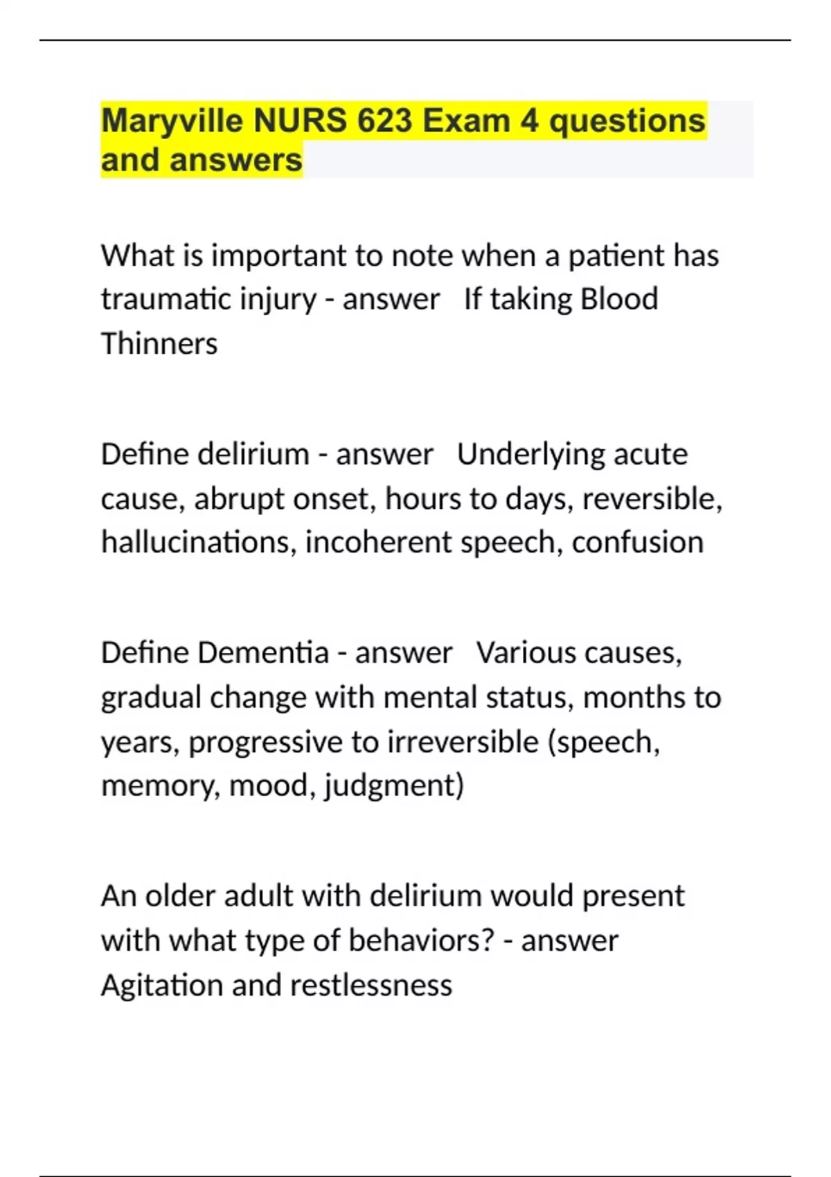 What is important to note when a patient has traumatic injury If taking Blood Thinners Define delirium Underlying acute cause, abrupt onset, hours to days, reversible, hallucinations, incoherent speech, confusion Previous Play Next Rewind 10 seconds Move forward 10 seconds Unmute 0:09 / 0:15 Full screen Brainpower Read More Define Dementia Various causes, gradual change with mental status, months to years, progressive to irreversible (speech, memory, mood, judgment) An older adult with delirium would present with what type of behaviors? Agitation and restlessness At the onset of alzheimers, what category of medications should be initiated? Cholinesterase inhibitors what factors contribute to a patient being high risk for falls? History of falls medications vision impairment heart rate/rhythm abnormalities footwear issues home environment gait/mobility issues poor reflexes What is the primary reason people have long term effects after a Stroke living at home and calling PCP instead of 911 leads to prolonged stroke symptoms and long term effects S/S of an Absense Seizure Blank stare (upward rotation of eye) Red Flags of back/neck pain Incontinence Fever Cancers Unexplained wt loss Long term steroids Trauma IV drug abuse Intense local pain No comfy Position Diagnosing of Alzheimer's Impaired ability to learn new info along with a disturbance in language, function, or perception S/S of Alzheimer's *C/O memory problems * ↑ cognitive difficulty * ↑ slow response to cognitive challenge *Word-finding difficulty * ↑ difficulty with simple tasks cardinal features of Parkinson's (TRAP)? *T-remor at rest (or pill rolling) *R-igidity *A-kinesia/Bradykinesia *P-ostural Disturbances What disease is "freezing phenomenon" a characteristic of? Parkinson's A 62 y/o patient calls and c/o of a headache what statement would cause the most concern? It's the worst headache I've ever had the headache from a subdural hematoma is of venous origin, typically resulting from ahead injury that is usually mild and easily forgotten by the patient. Temporal arteritis s/s of temporal (giant cell) arteritis * unilateral HA (temporal artery, orbital) * jaw claudication (pain with chewing) * temporary blindness (Medical Urgency) Polymyalgia rheumatica (pain/stiff muscles shoulders and hips) What age group is at higher risk for temporal arteritis >50 Clinical manifestations of Articular disorders? *characterized by deep or diffuse pain, pain or limited ROM on active and passive movement *swelling *crepitus Clinical manifestations of Non-Articular disorders? *Tend to be painful on active but not passive (assisted) ROM. *Seldom demonstrate swelling, crepitus, instability, or deformity by itself. What diagnostic assessment is most useful in a patient who presents with lumbar radiculopathy? The straight leg raise (assesses L5-S1). pain would indicate most common disc herniation What cranial nerve is affected in Bell's Palsy? CN VII S/S of Bell's Palsy * Acute onset one-sided Facial paralysis with normal ocular movement and sensation * Affects CN VII (facial)-VII(vestibulocochlear) * Loss of taste (dysgeusia) * Postauricular pain * Sound sensitivity (hyperacusis) * Heavy feeling in face How is Bell's Palsy diagnosed? Clinical history and exam What is a serious risk in patients with Bell's Palsey? Loss of the ability to blink and close the eyelid subjects the cornea to drying and ulceration Patient teaching for Bell's Palsey *reassure it is self-limiting with 3-6 month recovery *prevent corneal ulceration/ use artificial tears *unilateral and tends to have a throbbing or pulsatile (head) *precipitated by aura *nausea *vomiting *photophobia *phonophobia S/S of Migraine H/A A patient reports seeing flashes 20 minutes before having a severe H/A what type of H/A is it? Classic migraine *unilateral orbital, supraorbital, and/or temporal (headache) *causes lacrimation, rhinorrhea, and nasal congestion) S/S of cluster H/A bilateral, non-pulsating, tightening (head) pain that is not aggravated by routine physical activity. It is usually not accompanied by nausea and vomiting or photophobia. S/S of tension headache If a patient c/o sudden 'thunder clap' H/A worst in their life what is a diff dx that should be considered? Aneurism (subarachnoid hemorrhage) potential complications of steroid use in a patient with impaired integrity of bone structure? Increased risk of fracture what maneuver should be used to assess CERVICAL nerve-root compression. Spurling Symptoms are related to compression of the median nerve, which results in pain, paresthesia's, numbness and tingling, and associated weakness in the hand and wrist that radiate to the thumb, index finger, middle finger, and radial half of the ring finger Carpal Tunnel Syndrome Form of arthritis characterized by painful flare-ups in joints of distal extremities? Gout