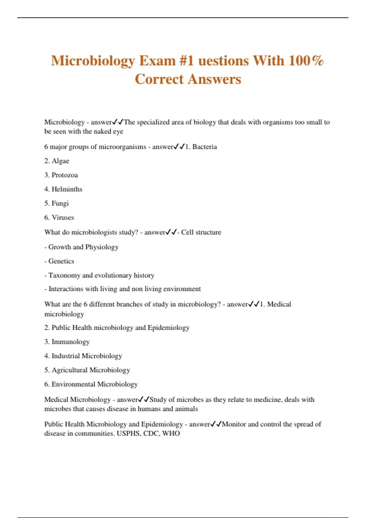 Microbiology Exam #1 uestions With 100% Correct Answers Microbiology - answerThe specialized area of biology that deals with organisms too small to be seen with the naked eye 6 major groups of microorganisms - answer1. Bacteria 2. Algae 3. Protozoa 4. Helminths 5. Fungi 6. Viruses What do microbiologists study? - answer- Cell structure - Growth and Physiology - Genetics - Taxonomy and evolutionary history - Interactions with living and non living environment What are the 6 different branches of study in microbiology? - answer1. Medical microbiology 2. Public Health microbiology and Epidemiology 3. Immunology 4. Industrial Microbiology 5. Agricultural Microbiology 6. Environmental Microbiology Medical Microbiology - answerStudy of microbes as they relate to medicine, deals with microbes that causes disease in humans and animals Public Health Microbiology and Epidemiology - answerMonitor and control the spread of disease in communities. USPHS, CDC, WHO Industrial Microbiology - answer- Use of microbes to manufacture important compounds - Safeguards our food and water - Also includes biotechnology - Ranges from bread making to gene therapy - Microbes can be used to create large quantities of substances such as amino acids, beer, drugs, enzymes, and vitamins Agricultural Microbiology - answer- Deals with the relationships between microbes and domesticated plants and animals - Plant specialists focus on plant diseases, soil fertility, and nutritional interactions - Animal specialists work with infectious diseases and other associations animals have with microorganisms Immunology - answerStudies a diverse areas such as vaccination, blood testing, and allergy. Immunologists investigate the role of the immune system in cancer and autoimmune diseases Environmental Microbiology - answerStudies the effect of microbes on the earth's diverse habitats. Example- aquatic microbiology, soil microbiology, geomicrobiology, and astrobiology eu-kary means? - answertrue nucleus; cells with a nucleus are classified as eukaryotes Pro-kary means? - answerPre-nucleus; bacteria and archaea do not have a nucleus and have been traditionally classified as prokaryotes What is a microbe? - answerA microorganism How are biology and microbiology different? How are they similar? - answerBiology is concerned with all the different scales of size that microorganisms exist on, but many fields on biology are concerned with more complex organisms such as mammals. Microbiology is concerned specifically with smaller, individual organisms. Microbiologists might be concerned with something as big as a bacteria, and they do study systems, such as the immune system, but generally they focus on smaller individual organisms. They are similar because they both study organisms, just on different scales. Bacteria - answer- Unicellular microorganisms - Some cause human, animal, or plant diseases; others are beneficial. - Prokaryotic Algae - answer- Unicellular microorganisms - Prokaryotic - Food or water borne - Reproduce Asexually - Photosythetic Protozoa - answer- Unicellular - Eukaryotic - Live independently or as parasites - Mostly found in soil or water Helminths - answer- Multicellular - Eukaryotic - Worms Fungi/Yeast - answer- Eukaryotic - Multicellular - Protists characterized by the absence of chlorophyll and by the presence of a rigid cell wall Medical Microbiology - answer- Deals with diseases of humans and animals - Study the way microorganisms cause disease - Example: A Microbiologist at the CDC may examine a culture of the influenza virus in order to understand why is is so harmful Public Health Microbiology & Epidemiology - answer- Monitor and control the spread of diseases in communities - CDC, USPHS, & WHO - Example: Epidemiologists conduct interviews as a part of the effort to curb the cholera epidemic in Haiti Immunology - answer- Studies the web of protective substances and cells produced in response to infection - Vaccination, blood testing, and allergy - Immunologists investigate the role of the immune system in cancer and autoimmune diseases - Example: Immunologists freeze dry samples of infectious diseases