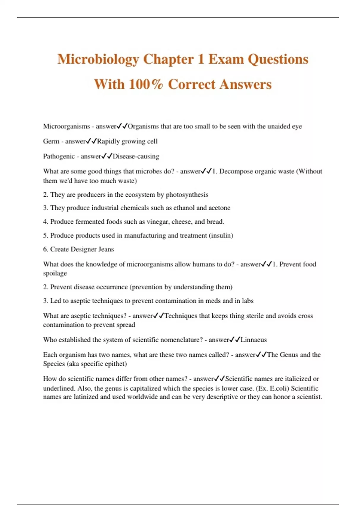 Microbiology Chapter 1 Exam Questions With 100% Correct Answers Microorganisms - answerOrganisms that are too small to be seen with the unaided eye Germ - answerRapidly growing cell Pathogenic - answerDisease-causing What are some good things that microbes do? - answer1. Decompose organic waste (Without them we'd have too much waste) 2. They are producers in the ecosystem by photosynthesis 3. They produce industrial chemicals such as ethanol and acetone 4. Produce fermented foods such as vinegar, cheese, and bread. 5. Produce products used in manufacturing and treatment (insulin) 6. Create Designer Jeans What does the knowledge of microorganisms allow humans to do? - answer1. Prevent food spoilage 2. Prevent disease occurrence (prevention by understanding them) 3. Led to aseptic techniques to prevent contamination in meds and in labs What are aseptic techniques? - answerTechniques that keeps thing sterile and avoids cross contamination to prevent spread Who established the system of scientific nomenclature? - answerLinnaeus Each organism has two names, what are these two names called? - answerThe Genus and the Species (aka specific epithet) How do scientific names differ from other names? - answerScientific names are italicized or underlined. Also, the genus is capitalized which the species is lower case. (Ex. E.coli) Scientific names are latinized and used worldwide and can be very descriptive or they can honor a scientist.